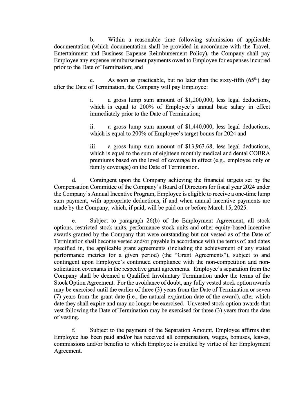 b. Within a reasonable time following submission of applicable documentation (which documentation shall be provided in accordance with the Travel, Entertainment and Business Expense Reimbursement Policy), the Company shall pay Employee any expense reimbursement payments owed to Employee for expenses incurred prior to the Date of Termination; and c. As soon as practicable, but no later than the sixty-fifth (65th) day after the Date of Termination, the Company will pay Employee: 1. a gross lump sum amount of $1,200,000, less legal deductions, which is equal to 200% of Employee's annual base salary in effect immediately prior to the Date of Termination; ii. a gross lump sum amount of $1,440,000, less legal deductions, which is equal to 200% of Employee's target bonus for 2024 and 111. a gross lump sum amount of $13,963.68, less legal deductions, which is equal to the sum of eighteen monthly medical and dental COBRA premiums based on the level of coverage in effect ( e.g., employee only or family coverage) on the Date of Termination. d. Contingent upon the Company achieving the financial targets set by the Compensation Committee of the Company's Board of Directors for fiscal year 2024 under the Company's Annual Incentive Program, Employee is eligible to receive a one-time lump sum payment, with appropriate deductions, if and when annual incentive payments are made by the Company, which, if paid, will be paid on or before March 15, 2025. e. Subject to paragraph 26(b) of the Employment Agreement, all stock options, restricted stock units, performance stock units and other equity-based incentive awards granted by the Company that were outstanding but not vested as of the Date of Termination shall become vested and/or payable in accordance with the terms of, and dates specified in, the applicable grant agreements (including the achievement of any stated performance metrics for a given period) (the "Grant Agreements"), subject to and contingent upon Employee's continued compliance with the non-competition and non­ solicitation covenants in the respective grant agreements. Employee's separation from the Company shall be deemed a Qualified Involuntary Termination under the terms of the Stock Option Agreement. For the avoidance of doubt, any fully vested stock option awards may be exercised until the earlier of three (3) years from the Date of Termination or seven (7) years from the grant date (i.e., the natural expiration date of the award), after which date they shall expire and may no longer be exercised. Unvested stock option awards that vest following the Date of Termination may be exercised for three (3) years from the date of vesting. f. Subject to the payment of the Separation Amount, Employee affirms that Employee has been paid and/or has received all compensation, wages, bonuses, leaves, commissions and/or benefits to which Employee is entitled by virtue of her Employment Agreement.