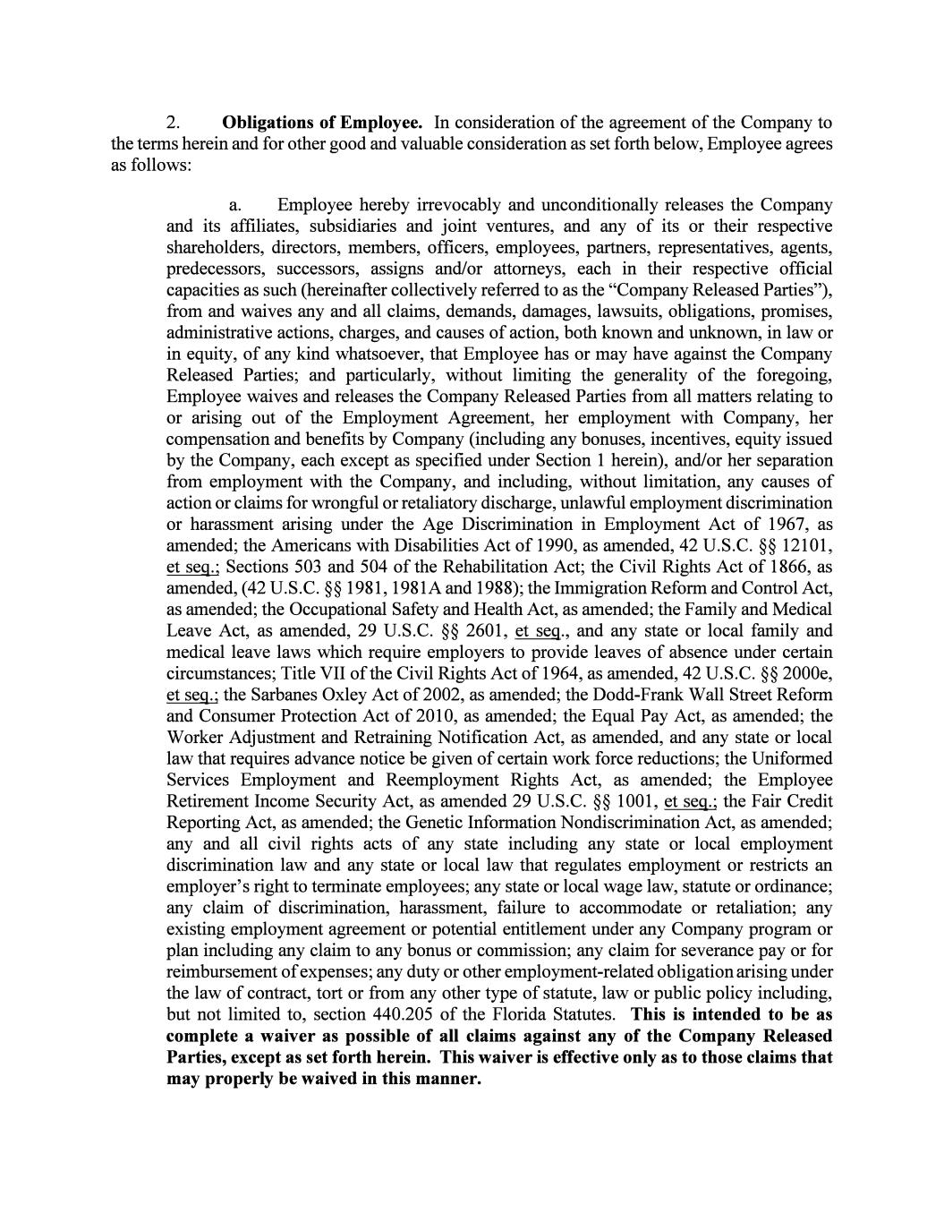 2. Obligations of Employee. In consideration of the agreement of the Company to the terms herein and for other good and valuable consideration as set forth below, Employee agrees as follows: a. Employee hereby irrevocably and unconditionally releases the Company and its affiliates, subsidiaries and joint ventures, and any of its or their respective shareholders, directors, members, officers, employees, partners, representatives, agents, predecessors, successors, assigns and/or attorneys, each in their respective official capacities as such (hereinafter collectively referred to as the "Company Released Parties"), from and waives any and all claims, demands, damages, lawsuits, obligations, promises, administrative actions, charges, and causes of action, both known and unknown, in law or in equity, of any kind whatsoever, that Employee has or may have against the Company Released Parties; and particularly, without limiting the generality of the foregoing, Employee waives and releases the Company Released Parties from all matters relating to or arising out of the Employment Agreement, her employment with Company, her compensation and benefits by Company (including any bonuses, incentives, equity issued by the Company, each except as specified under Section 1 herein), and/or her separation from employment with the Company, and including, without limitation, any causes of action or claims for wrongful or retaliatory discharge, unlawful employment discrimination or harassment arising under the Age Discrimination in Employment Act of 1967, as amended; the Americans with Disabilities Act of 1990, as amended, 42 U.S.C. §§ 12101, et seq.; Sections 503 and 504 of the Rehabilitation Act; the Civil Rights Act of 1866, as amended, (42 U.S.C. §§ 1981, 1981A and 1988); the Immigration Reform and Control Act, as amended; the Occupational Safety and Health Act, as amended; the Family and Medical Leave Act, as amended, 29 U.S.C. §§ 2601, et seq .. and any state or local family and medical leave laws which require employers to provide leaves of absence under certain circumstances; Title VII of the Civil Rights Act of 1964, as amended, 42 U.S.C. §§ 2000e, et seq.; the Sarbanes Oxley Act of 2002, as amended; the Dodd-Frank Wall Street Reform and Consumer Protection Act of 2010, as amended; the Equal Pay Act, as amended; the Worker Adjustment and Retraining Notification Act, as amended, and any state or local law that requires advance notice be given of certain work force reductions; the Uniformed Services Employment and Reemployment Rights Act, as amended; the Employee Retirement Income Security Act, as amended 29 U.S.C. §§ 1001, et seq.; the Fair Credit Reporting Act, as amended; the Genetic Information Nondiscrimination Act, as amended; any and all civil rights acts of any state including any state or local employment discrimination law and any state or local law that regulates employment or restricts an employer's right to terminate employees; any state or local wage law, statute or ordinance; any claim of discrimination, harassment, failure to accommodate or retaliation; any existing employment agreement or potential entitlement under any Company program or plan including any claim to any bonus or commission; any claim for severance pay or for reimbursement of expenses; any duty or other employment-related obligation arising under the law of contract, tort or from any other type of statute, law or public policy including, but not limited to, section 440.205 of the Florida Statutes. This is intended to be as complete a waiver as possible of all claims against any of the Company Released Parties, except as set forth herein. This waiver is effective only as to those claims that may properly be waived in this manner.