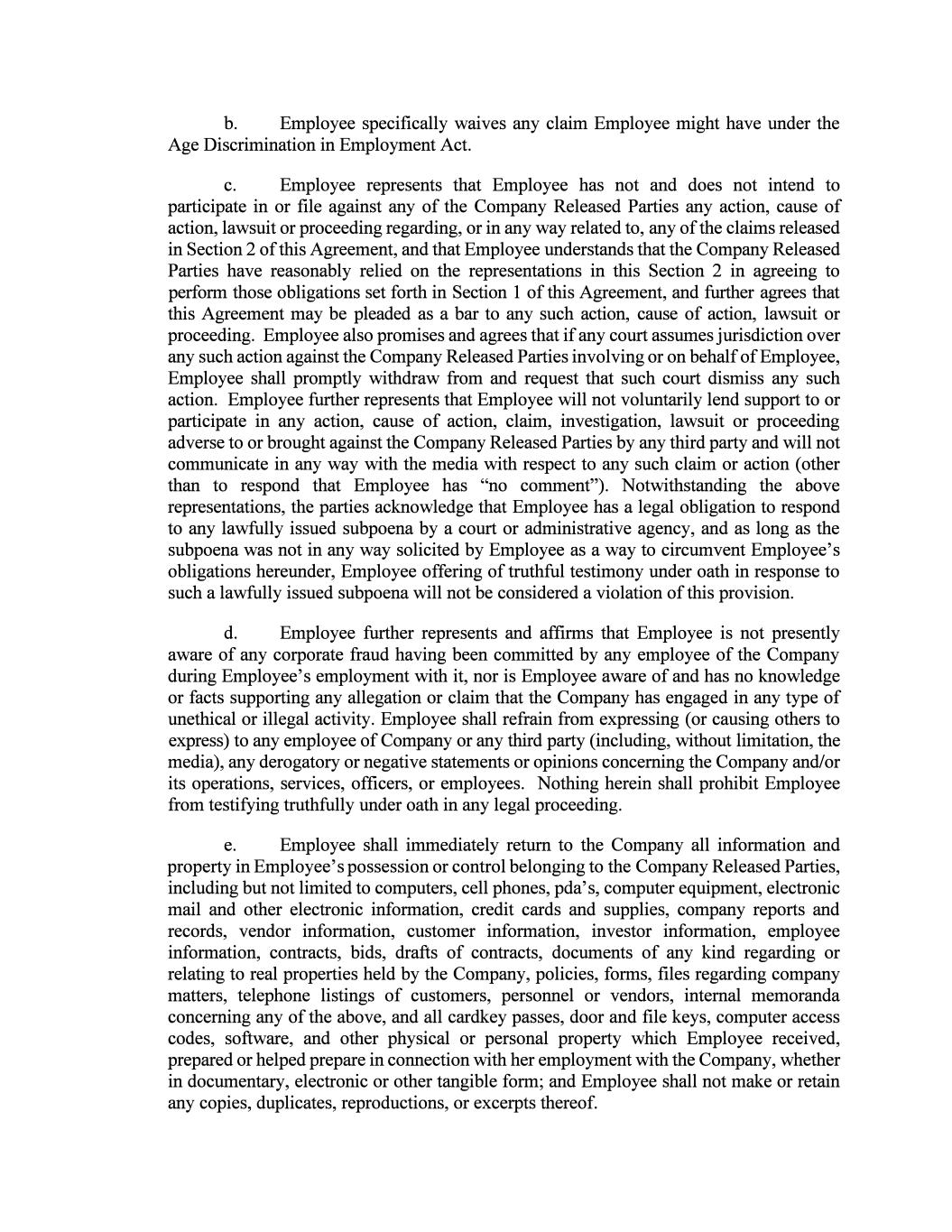 b. Employee specifically waives any claim Employee might have under the Age Discrimination in Employment Act. c. Employee represents that Employee has not and does not intend to participate in or file against any of the Company Released Parties any action, cause of action, lawsuit or proceeding regarding, or in any way related to, any of the claims released in Section 2 of this Agreement, and that Employee understands that the Company Released Parties have reasonably relied on the representations in this Section 2 in agreeing to perform those obligations set forth in Section 1 of this Agreement, and further agrees that this Agreement may be pleaded as a bar to any such action, cause of action, lawsuit or proceeding. Employee also promises and agrees that if any court assumes jurisdiction over any such action against the Company Released Parties involving or on behalf of Employee, Employee shall promptly withdraw from and request that such court dismiss any such action. Employee further represents that Employee will not voluntarily lend support to or participate in any action, cause of action, claim, investigation, lawsuit or proceeding adverse to or brought against the Company Released Parties by any third party and will not communicate in any way with the media with respect to any such claim or action ( other than to respond that Employee has "no comment"). Notwithstanding the above representations, the parties acknowledge that Employee has a legal obligation to respond to any lawfully issued subpoena by a court or administrative agency, and as long as the subpoena was not in any way solicited by Employee as a way to circumvent Employee's obligations hereunder, Employee offering of truthful testimony under oath in response to such a lawfully issued subpoena will not be considered a violation of this provision. d. Employee further represents and affirms that Employee is not presently aware of any corporate fraud having been committed by any employee of the Company during Employee's employment with it, nor is Employee aware of and has no knowledge or facts supporting any allegation or claim that the Company has engaged in any type of unethical or illegal activity. Employee shall refrain from expressing (or causing others to express) to any employee of Company or any third party (including, without limitation, the media), any derogatory or negative statements or opinions concerning the Company and/or its operations, services, officers, or employees. Nothing herein shall prohibit Employee from testifying truthfully under oath in any legal proceeding. e. Employee shall immediately return to the Company all information and property in Employee's possession or control belonging to the Company Released Parties, including but not limited to computers, cell phones, pda' s, computer equipment, electronic mail and other electronic information, credit cards and supplies, company reports and records, vendor information, customer information, investor information, employee information, contracts, bids, drafts of contracts, documents of any kind regarding or relating to real properties held by the Company, policies, forms, files regarding company matters, telephone listings of customers, personnel or vendors, internal memoranda concerning any of the above, and all cardkey passes, door and file keys, computer access codes, software, and other physical or personal property which Employee received, prepared or helped prepare in connection with her employment with the Company, whether in documentary, electronic or other tangible form; and Employee shall not make or retain any copies, duplicates, reproductions, or excerpts thereof.