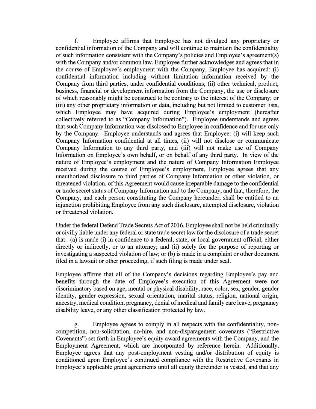 f. Employee affirms that Employee has not divulged any proprietary or confidential information of the Company and will continue to maintain the confidentiality of such information consistent with the Company's policies and Employee's agreement(s) with the Company and/or common law. Employee further acknowledges and agrees that in the course of Employee's employment with the Company, Employee has acquired: (i) confidential information including without limitation information received by the Company from third parties, under confidential conditions; (ii) other technical, product, business, financial or development information from the Company, the use or disclosure of which reasonably might be construed to be contrary to the interest of the Company; or (iii) any other proprietary information or data, including but not limited to customer lists, which Employee may have acquired during Employee's employment (hereafter collectively referred to as "Company Information"). Employee understands and agrees that such Company Information was disclosed to Employee in confidence and for use only by the Company. Employee understands and agrees that Employee: (i) will keep such Company Information confidential at all times, (ii) will not disclose or communicate Company Information to any third party, and (iii) will not make use of Company Information on Employee's own behalf, or on behalf of any third party. In view of the nature of Employee's employment and the nature of Company Information Employee received during the course of Employee's employment, Employee agrees that any unauthorized disclosure to third parties of Company Information or other violation, or threatened violation, of this Agreement would cause irreparable damage to the confidential or trade secret status of Company Information and to the Company, and that, therefore, the Company, and each person constituting the Company hereunder, shall be entitled to an injunction prohibiting Employee from any such disclosure, attempted disclosure, violation or threatened violation. Under the federal Defend Trade Secrets Act of 2016, Employee shall not be held criminally or civilly liable under any federal or state trade secret law for the disclosure of a trade secret that: (a) is made (i) in confidence to a federal, state, or local government official, either directly or indirectly, or to an attorney; and (ii) solely for the purpose of reporting or investigating a suspected violation of law; or (b) is made in a complaint or other document filed in a lawsuit or other proceeding, if such filing is made under seal. Employee affirms that all of the Company's decisions regarding Employee's pay and benefits through the date of Employee's execution of this Agreement were not discriminatory based on age, mental or physical disability, race, color, sex, gender, gender identity, gender expression, sexual orientation, marital status, religion, national origin, ancestry, medical condition, pregnancy, denial of medical and family care leave, pregnancy disability leave, or any other classification protected by law. g. Employee agrees to comply in all respects with the confidentiality, non- competition, non-solicitation, no-hire, and non-disparagement covenants ("Restrictive Covenants") set forth in Employee's equity award agreements with the Company, and the Employment Agreement, which are incorporated by reference herein. Additionally, Employee agrees that any post-employment vesting and/or distribution of equity is conditioned upon Employee's continued compliance with the Restrictive Covenants in Employee's applicable grant agreements until all equity thereunder is vested, and that any