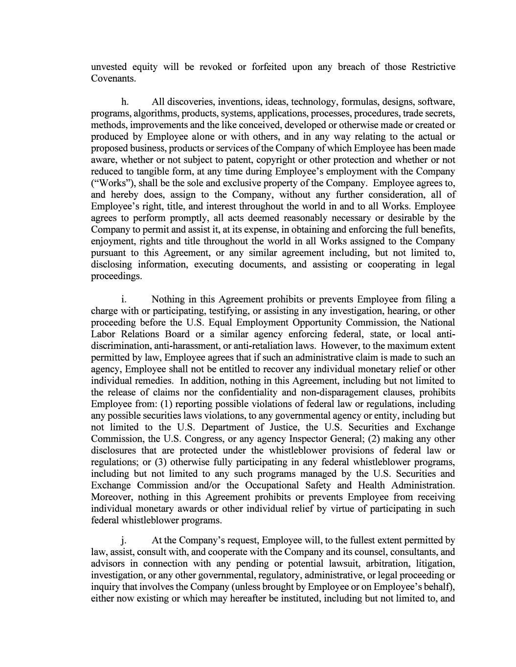unvested equity will be revoked or forfeited upon any breach of those Restrictive Covenants. h. All discoveries, inventions, ideas, technology, formulas, designs, software, programs, algorithms, products, systems, applications, processes, procedures, trade secrets, methods, improvements and the like conceived, developed or otherwise made or created or produced by Employee alone or with others, and in any way relating to the actual or proposed business, products or services of the Company of which Employee has been made aware, whether or not subject to patent, copyright or other protection and whether or not reduced to tangible form, at any time during Employee's employment with the Company ("Works"), shall be the sole and exclusive property of the Company. Employee agrees to, and hereby does, assign to the Company, without any further consideration, all of Employee's right, title, and interest throughout the world in and to all Works. Employee agrees to perform promptly, all acts deemed reasonably necessary or desirable by the Company to permit and assist it, at its expense, in obtaining and enforcing the full benefits, enjoyment, rights and title throughout the world in all Works assigned to the Company pursuant to this Agreement, or any similar agreement including, but not limited to, disclosing information, executing documents, and assisting or cooperating in legal proceedings. i. Nothing in this Agreement prohibits or prevents Employee from filing a charge with or participating, testifying, or assisting in any investigation, hearing, or other proceeding before the U.S. Equal Employment Opportunity Commission, the National Labor Relations Board or a similar agency enforcing federal, state, or local anti­ discrimination, anti-harassment, or anti-retaliation laws. However, to the maximum extent permitted by law, Employee agrees that if such an administrative claim is made to such an agency, Employee shall not be entitled to recover any individual monetary relief or other individual remedies. In addition, nothing in this Agreement, including but not limited to the release of claims nor the confidentiality and non-disparagement clauses, prohibits Employee from: (1) reporting possible violations of federal law or regulations, including any possible securities laws violations, to any governmental agency or entity, including but not limited to the U.S. Department of Justice, the U.S. Securities and Exchange Commission, the U.S. Congress, or any agency Inspector General; (2) making any other disclosures that are protected under the whistleblower provisions of federal law or regulations; or (3) otherwise fully participating in any federal whistleblower programs, including but not limited to any such programs managed by the U.S. Securities and Exchange Commission and/or the Occupational Safety and Health Administration. Moreover, nothing in this Agreement prohibits or prevents Employee from receiving individual monetary awards or other individual relief by virtue of participating in such federal whistleblower programs. j. At the Company's request, Employee will, to the fullest extent permitted by law, assist, consult with, and cooperate with the Company and its counsel, consultants, and advisors in connection with any pending or potential lawsuit, arbitration, litigation, investigation, or any other governmental, regulatory, administrative, or legal proceeding or inquiry that involves the Company (unless brought by Employee or on Employee's behalf), either now existing or which may hereafter be instituted, including but not limited to, and