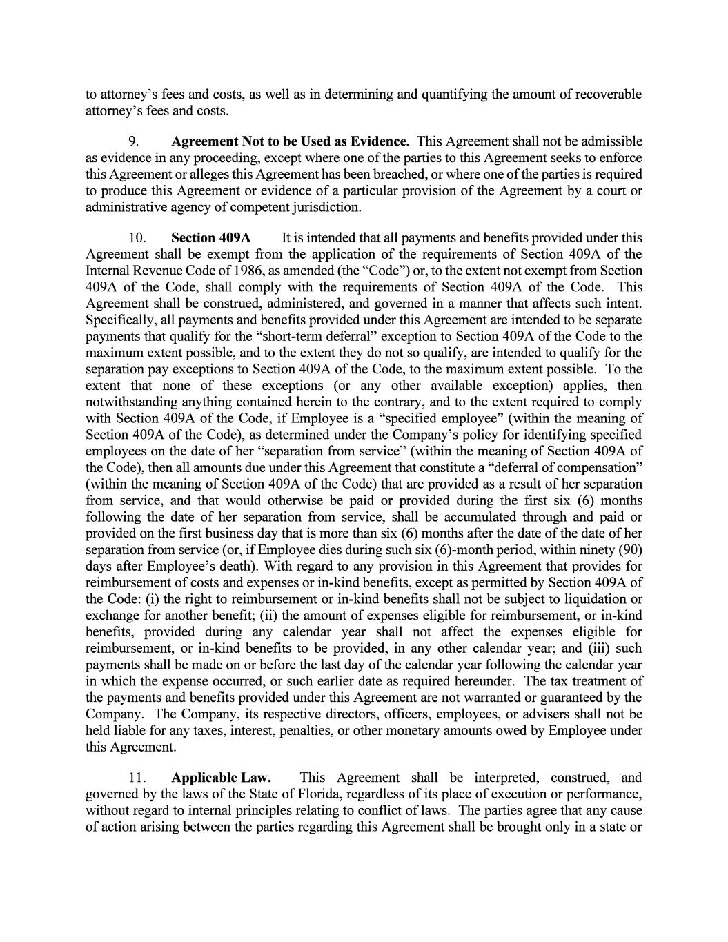 to attorney's fees and costs, as well as in determining and quantifying the amount of recoverable attorney's fees and costs. 9. Agreement Not to be Used as Evidence. This Agreement shall not be admissible as evidence in any proceeding, except where one of the parties to this Agreement seeks to enforce this Agreement or alleges this Agreement has been breached, or where one of the parties is required to produce this Agreement or evidence of a particular provision of the Agreement by a court or administrative agency of competent jurisdiction. 10. Section 409A It is intended that all payments and benefits provided under this Agreement shall be exempt from the application of the requirements of Section 409A of the Internal Revenue Code of 1986, as amended ( the "Code") or, to the extent not exempt from Section 409A of the Code, shall comply with the requirements of Section 409A of the Code. This Agreement shall be construed, administered, and governed in a manner that affects such intent. Specifically, all payments and benefits provided under this Agreement are intended to be separate payments that qualify for the "short-term deferral" exception to Section 409A of the Code to the maximum extent possible, and to the extent they do not so qualify, are intended to qualify for the separation pay exceptions to Section 409A of the Code, to the maximum extent possible. To the extent that none of these exceptions ( or any other available exception) applies, then notwithstanding anything contained herein to the contrary, and to the extent required to comply with Section 409A of the Code, if Employee is a "specified employee" (within the meaning of Section 409A of the Code), as determined under the Company's policy for identifying specified employees on the date of her "separation from service" (within the meaning of Section 409A of the Code), then all amounts due under this Agreement that constitute a "deferral of compensation" ( within the meaning of Section 409 A of the Code) that are provided as a result of her separation from service, and that would otherwise be paid or provided during the first six ( 6) months following the date of her separation from service, shall be accumulated through and paid or provided on the first business day that is more than six ( 6) months after the date of the date of her separation from service (or, if Employee dies during such six (6)-month period, within ninety (90) days after Employee's death). With regard to any provision in this Agreement that provides for reimbursement of costs and expenses or in-kind benefits, except as permitted by Section 409A of the Code: (i) the right to reimbursement or in-kind benefits shall not be subject to liquidation or exchange for another benefit; (ii) the amount of expenses eligible for reimbursement, or in-kind benefits, provided during any calendar year shall not affect the expenses eligible for reimbursement, or in-kind benefits to be provided, in any other calendar year; and (iii) such payments shall be made on or before the last day of the calendar year following the calendar year in which the expense occurred, or such earlier date as required hereunder. The tax treatment of the payments and benefits provided under this Agreement are not warranted or guaranteed by the Company. The Company, its respective directors, officers, employees, or advisers shall not be held liable for any taxes, interest, penalties, or other monetary amounts owed by Employee under this Agreement. 11. Applicable Law. This Agreement shall be interpreted, construed, and governed by the laws of the State of Florida, regardless of its place of execution or performance, without regard to internal principles relating to conflict of laws. The parties agree that any cause of action arising between the parties regarding this Agreement shall be brought only in a state or