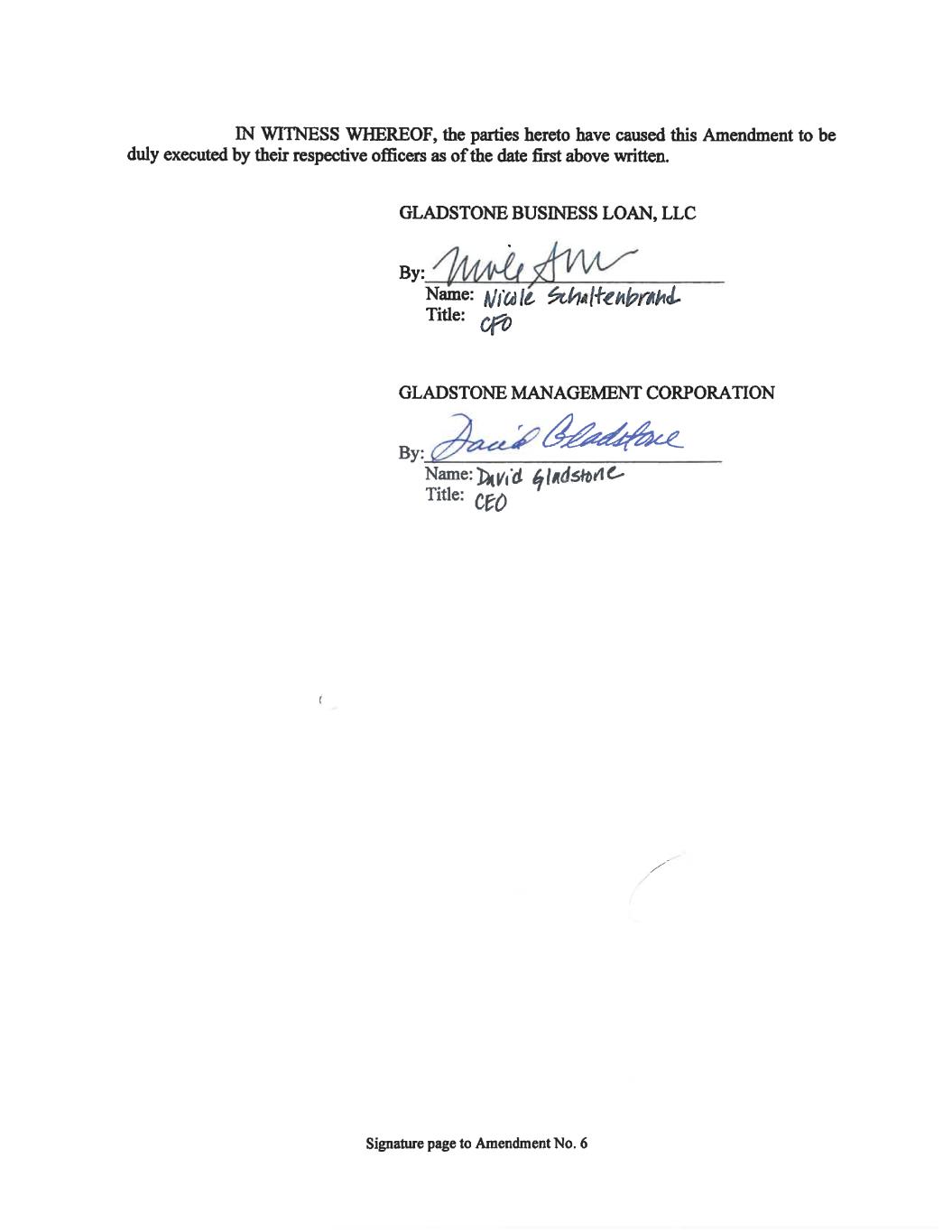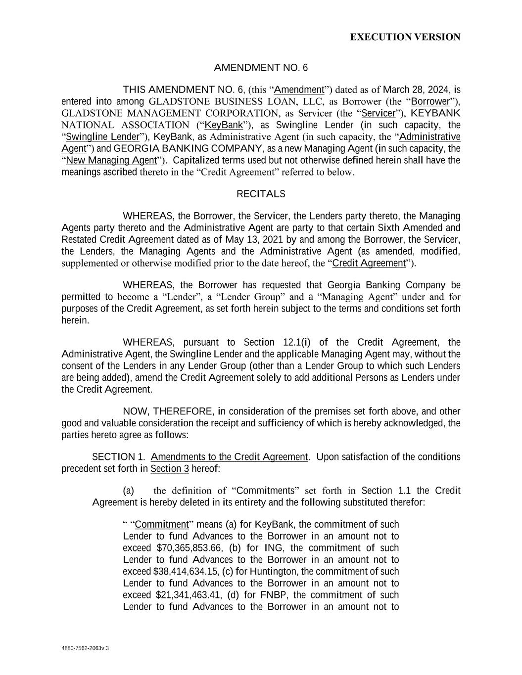 EXECUTION VERSION AMENDMENT NO. 6 THIS AMENDMENT NO. 6, (this “Amendment”) dated as of March 28, 2024, is entered into among GLADSTONE BUSINESS LOAN, LLC, as Borrower (the “Borrower”), GLADSTONE MANAGEMENT CORPORATION, as Servicer (the “Servicer”), KEYBANK NATIONAL ASSOCIATION (“KeyBank”), as Swingline Lender (in such capacity, the “Swingline Lender”), KeyBank, as Administrative Agent (in such capacity, the “Administrative Agent”) and GEORGIA BANKING COMPANY, as a new Managing Agent (in such capacity, the “New Managing Agent”). Capitalized terms used but not otherwise defined herein shall have the meanings ascribed thereto in the “Credit Agreement” referred to below. RECITALS WHEREAS, the Borrower, the Servicer, the Lenders party thereto, the Managing Agents party thereto and the Administrative Agent are party to that certain Sixth Amended and Restated Credit Agreement dated as of May 13, 2021 by and among the Borrower, the Servicer, the Lenders, the Managing Agents and the Administrative Agent (as amended, modified, supplemented or otherwise modified prior to the date hereof, the “Credit Agreement”). WHEREAS, the Borrower has requested that Georgia Banking Company be permitted to become a “Lender”, a “Lender Group” and a “Managing Agent” under and for purposes of the Credit Agreement, as set forth herein subject to the terms and conditions set forth herein. WHEREAS, pursuant to Section 12.1(i) of the Credit Agreement, the Administrative Agent, the Swingline Lender and the applicable Managing Agent may, without the consent of the Lenders in any Lender Group (other than a Lender Group to which such Lenders are being added), amend the Credit Agreement solely to add additional Persons as Lenders under the Credit Agreement. NOW, THEREFORE, in consideration of the premises set forth above, and other good and valuable consideration the receipt and sufficiency of which is hereby acknowledged, the parties hereto agree as follows: SECTION 1. Amendments to the Credit Agreement. Upon satisfaction of the conditions precedent set forth in Section 3 hereof: (a) the definition of “Commitments” set forth in Section 1.1 the Credit Agreement is hereby deleted in its entirety and the following substituted therefor: “ “Commitment” means (a) for KeyBank, the commitment of such Lender to fund Advances to the Borrower in an amount not to exceed $70,365,853.66, (b) for ING, the commitment of such Lender to fund Advances to the Borrower in an amount not to exceed $38,414,634.15, (c) for Huntington, the commitment of such Lender to fund Advances to the Borrower in an amount not to exceed $21,341,463.41, (d) for FNBP, the commitment of such Lender to fund Advances to the Borrower in an amount not to 4880-7562-2063v.3