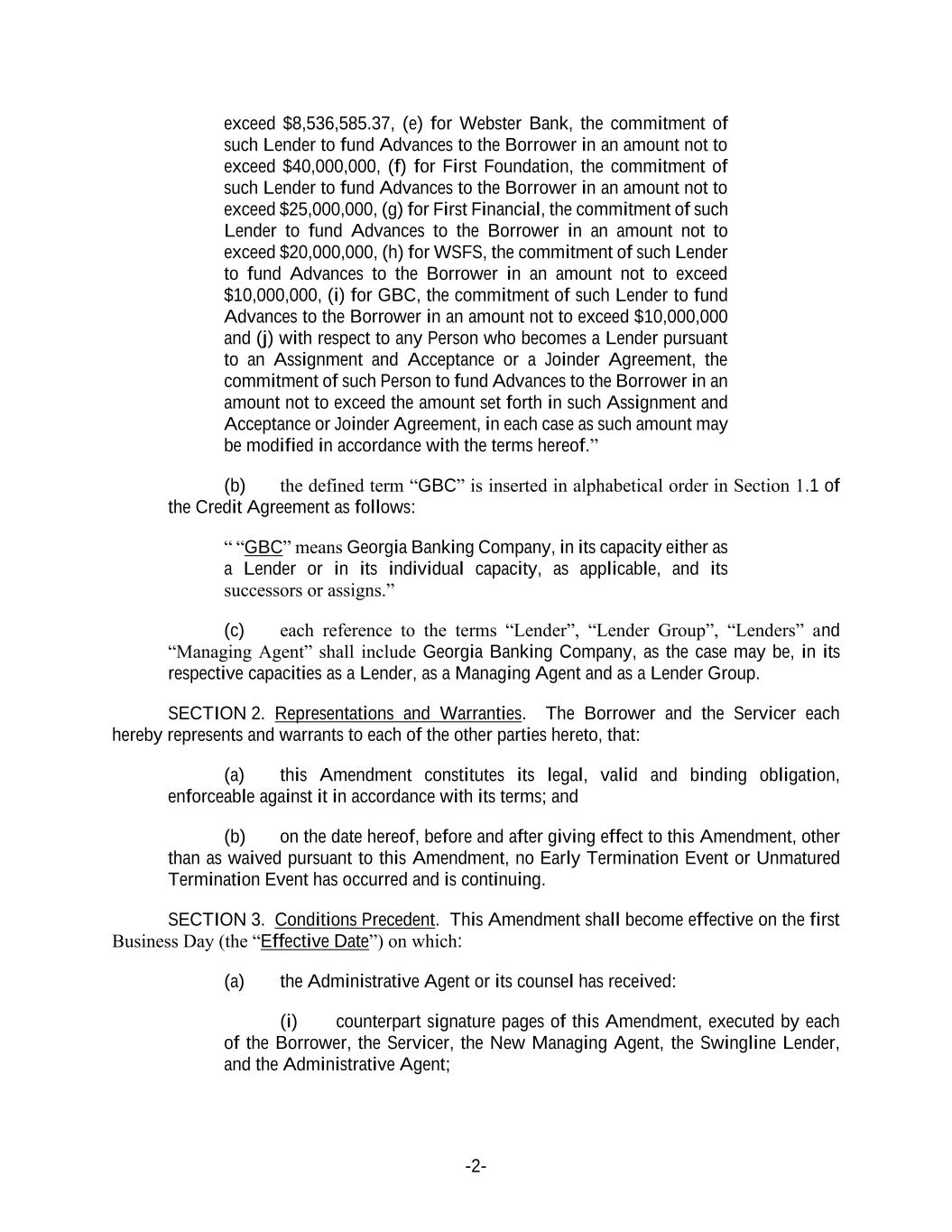 -2- exceed $8,536,585.37, (e) for Webster Bank, the commitment of such Lender to fund Advances to the Borrower in an amount not to exceed $40,000,000, (f) for First Foundation, the commitment of such Lender to fund Advances to the Borrower in an amount not to exceed $25,000,000, (g) for First Financial, the commitment of such Lender to fund Advances to the Borrower in an amount not to exceed $20,000,000, (h) for WSFS, the commitment of such Lender to fund Advances to the Borrower in an amount not to exceed $10,000,000, (i) for GBC, the commitment of such Lender to fund Advances to the Borrower in an amount not to exceed $10,000,000 and (j) with respect to any Person who becomes a Lender pursuant to an Assignment and Acceptance or a Joinder Agreement, the commitment of such Person to fund Advances to the Borrower in an amount not to exceed the amount set forth in such Assignment and Acceptance or Joinder Agreement, in each case as such amount may be modified in accordance with the terms hereof.” (b) the defined term “GBC” is inserted in alphabetical order in Section 1.1 of the Credit Agreement as follows: “ “GBC” means Georgia Banking Company, in its capacity either as a Lender or in its individual capacity, as applicable, and its successors or assigns.” (c) each reference to the terms “Lender”, “Lender Group”, “Lenders” and “Managing Agent” shall include Georgia Banking Company, as the case may be, in its respective capacities as a Lender, as a Managing Agent and as a Lender Group. SECTION 2. Representations and Warranties. The Borrower and the Servicer each hereby represents and warrants to each of the other parties hereto, that: (a) this Amendment constitutes its legal, valid and binding obligation, enforceable against it in accordance with its terms; and (b) on the date hereof, before and after giving effect to this Amendment, other than as waived pursuant to this Amendment, no Early Termination Event or Unmatured Termination Event has occurred and is continuing. SECTION 3. Conditions Precedent. This Amendment shall become effective on the first Business Day (the “Effective Date”) on which: (a) the Administrative Agent or its counsel has received: (i) counterpart signature pages of this Amendment, executed by each of the Borrower, the Servicer, the New Managing Agent, the Swingline Lender, and the Administrative Agent;