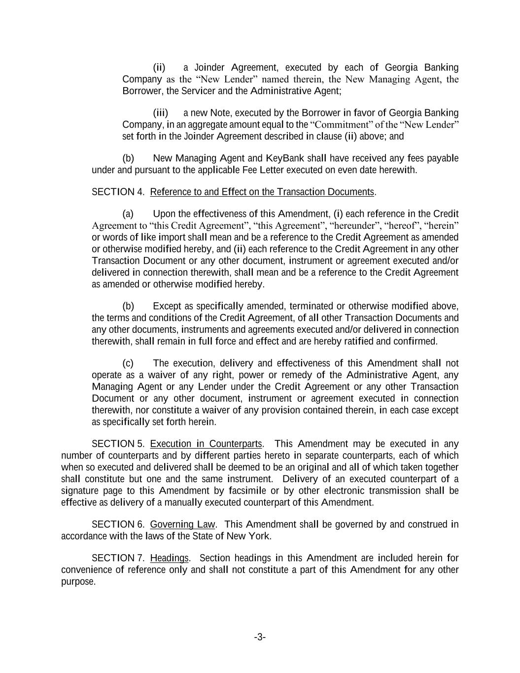 -3- (ii) a Joinder Agreement, executed by each of Georgia Banking Company as the “New Lender” named therein, the New Managing Agent, the Borrower, the Servicer and the Administrative Agent; (iii) a new Note, executed by the Borrower in favor of Georgia Banking Company, in an aggregate amount equal to the “Commitment” of the “New Lender” set forth in the Joinder Agreement described in clause (ii) above; and (b) New Managing Agent and KeyBank shall have received any fees payable under and pursuant to the applicable Fee Letter executed on even date herewith. SECTION 4. Reference to and Effect on the Transaction Documents. (a) Upon the effectiveness of this Amendment, (i) each reference in the Credit Agreement to “this Credit Agreement”, “this Agreement”, “hereunder”, “hereof”, “herein” or words of like import shall mean and be a reference to the Credit Agreement as amended or otherwise modified hereby, and (ii) each reference to the Credit Agreement in any other Transaction Document or any other document, instrument or agreement executed and/or delivered in connection therewith, shall mean and be a reference to the Credit Agreement as amended or otherwise modified hereby. (b) Except as specifically amended, terminated or otherwise modified above, the terms and conditions of the Credit Agreement, of all other Transaction Documents and any other documents, instruments and agreements executed and/or delivered in connection therewith, shall remain in full force and effect and are hereby ratified and confirmed. (c) The execution, delivery and effectiveness of this Amendment shall not operate as a waiver of any right, power or remedy of the Administrative Agent, any Managing Agent or any Lender under the Credit Agreement or any other Transaction Document or any other document, instrument or agreement executed in connection therewith, nor constitute a waiver of any provision contained therein, in each case except as specifically set forth herein. SECTION 5. Execution in Counterparts. This Amendment may be executed in any number of counterparts and by different parties hereto in separate counterparts, each of which when so executed and delivered shall be deemed to be an original and all of which taken together shall constitute but one and the same instrument. Delivery of an executed counterpart of a signature page to this Amendment by facsimile or by other electronic transmission shall be effective as delivery of a manually executed counterpart of this Amendment. SECTION 6. Governing Law. This Amendment shall be governed by and construed in accordance with the laws of the State of New York. SECTION 7. Headings. Section headings in this Amendment are included herein for convenience of reference only and shall not constitute a part of this Amendment for any other purpose.