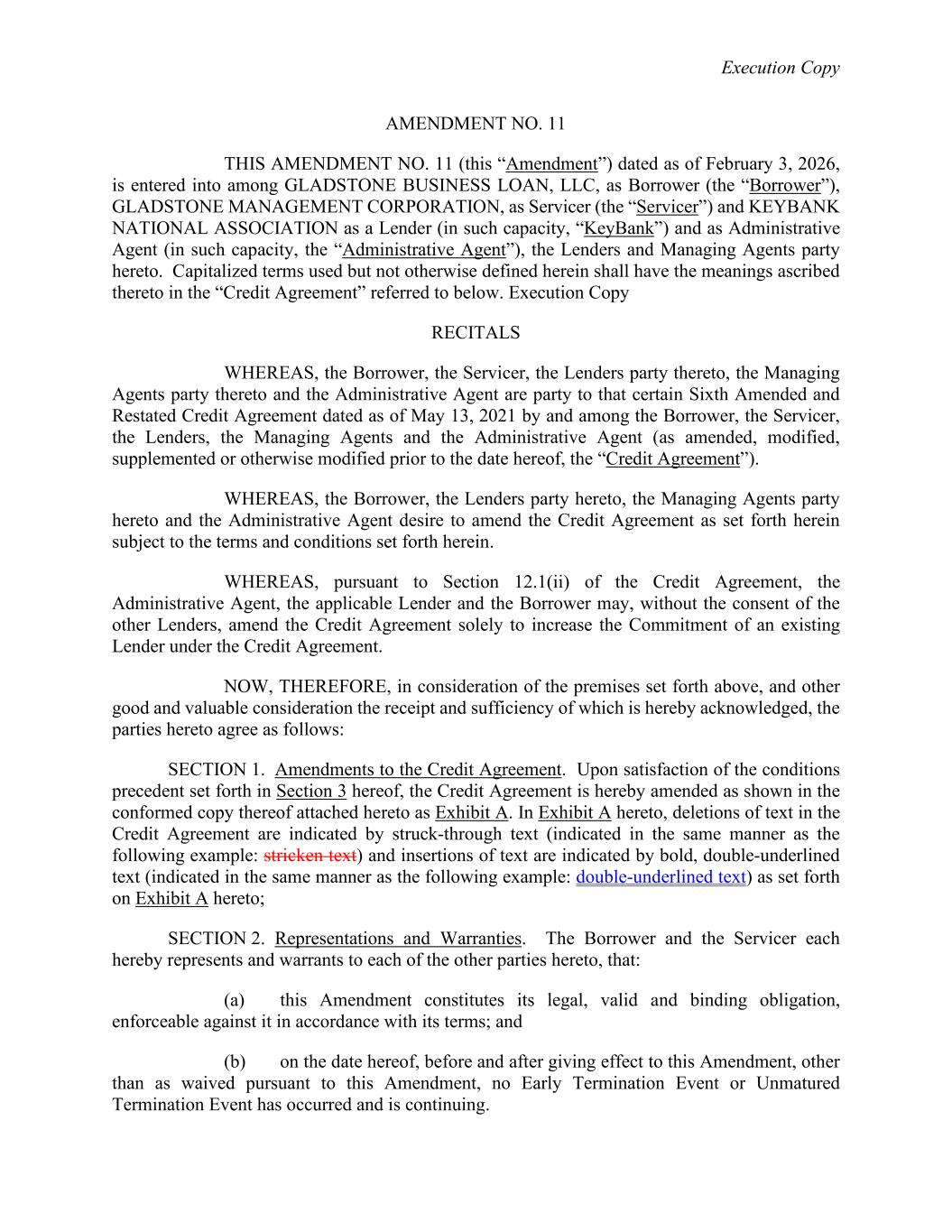 Execution Copy AMENDMENT NO. 11 THIS AMENDMENT NO. 11 (this “Amendment”) dated as of February 3, 2026, is entered into among GLADSTONE BUSINESS LOAN, LLC, as Borrower (the “Borrower”), GLADSTONE MANAGEMENT CORPORATION, as Servicer (the “Servicer”) and KEYBANK NATIONAL ASSOCIATION as a Lender (in such capacity, “KeyBank”) and as Administrative Agent (in such capacity, the “Administrative Agent”), the Lenders and Managing Agents party hereto. Capitalized terms used but not otherwise defined herein shall have the meanings ascribed thereto in the “Credit Agreement” referred to below. Execution Copy RECITALS WHEREAS, the Borrower, the Servicer, the Lenders party thereto, the Managing Agents party thereto and the Administrative Agent are party to that certain Sixth Amended and Restated Credit Agreement dated as of May 13, 2021 by and among the Borrower, the Servicer, the Lenders, the Managing Agents and the Administrative Agent (as amended, modified, supplemented or otherwise modified prior to the date hereof, the “Credit Agreement”). WHEREAS, the Borrower, the Lenders party hereto, the Managing Agents party hereto and the Administrative Agent desire to amend the Credit Agreement as set forth herein subject to the terms and conditions set forth herein. WHEREAS, pursuant to Section 12.1(ii) of the Credit Agreement, the Administrative Agent, the applicable Lender and the Borrower may, without the consent of the other Lenders, amend the Credit Agreement solely to increase the Commitment of an existing Lender under the Credit Agreement. NOW, THEREFORE, in consideration of the premises set forth above, and other good and valuable consideration the receipt and sufficiency of which is hereby acknowledged, the parties hereto agree as follows: SECTION 1. Amendments to the Credit Agreement. Upon satisfaction of the conditions precedent set forth in Section 3 hereof, the Credit Agreement is hereby amended as shown in the conformed copy thereof attached hereto as Exhibit A. In Exhibit A hereto, deletions of text in the Credit Agreement are indicated by struck-through text (indicated in the same manner as the following example: stricken text) and insertions of text are indicated by bold, double-underlined text (indicated in the same manner as the following example: double-underlined text) as set forth on Exhibit A hereto; SECTION 2. Representations and Warranties. The Borrower and the Servicer each hereby represents and warrants to each of the other parties hereto, that: (a) this Amendment constitutes its legal, valid and binding obligation, enforceable against it in accordance with its terms; and (b) on the date hereof, before and after giving effect to this Amendment, other than as waived pursuant to this Amendment, no Early Termination Event or Unmatured Termination Event has occurred and is continuing.