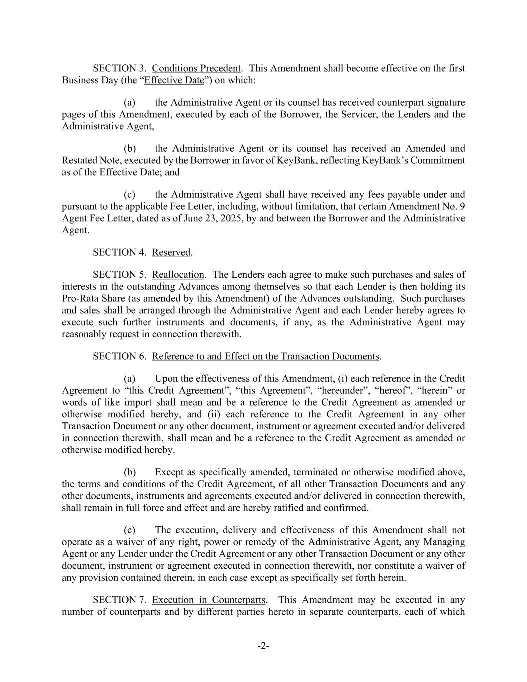 -2- SECTION 3. Conditions Precedent. This Amendment shall become effective on the first Business Day (the “Effective Date”) on which: (a) the Administrative Agent or its counsel has received counterpart signature pages of this Amendment, executed by each of the Borrower, the Servicer, the Lenders and the Administrative Agent, (b) the Administrative Agent or its counsel has received an Amended and Restated Note, executed by the Borrower in favor of KeyBank, reflecting KeyBank’s Commitment as of the Effective Date; and (c) the Administrative Agent shall have received any fees payable under and pursuant to the applicable Fee Letter, including, without limitation, that certain Amendment No. 9 Agent Fee Letter, dated as of June 23, 2025, by and between the Borrower and the Administrative Agent. SECTION 4. Reserved. SECTION 5. Reallocation. The Lenders each agree to make such purchases and sales of interests in the outstanding Advances among themselves so that each Lender is then holding its Pro-Rata Share (as amended by this Amendment) of the Advances outstanding. Such purchases and sales shall be arranged through the Administrative Agent and each Lender hereby agrees to execute such further instruments and documents, if any, as the Administrative Agent may reasonably request in connection therewith. SECTION 6. Reference to and Effect on the Transaction Documents. (a) Upon the effectiveness of this Amendment, (i) each reference in the Credit Agreement to “this Credit Agreement”, “this Agreement”, “hereunder”, “hereof”, “herein” or words of like import shall mean and be a reference to the Credit Agreement as amended or otherwise modified hereby, and (ii) each reference to the Credit Agreement in any other Transaction Document or any other document, instrument or agreement executed and/or delivered in connection therewith, shall mean and be a reference to the Credit Agreement as amended or otherwise modified hereby. (b) Except as specifically amended, terminated or otherwise modified above, the terms and conditions of the Credit Agreement, of all other Transaction Documents and any other documents, instruments and agreements executed and/or delivered in connection therewith, shall remain in full force and effect and are hereby ratified and confirmed. (c) The execution, delivery and effectiveness of this Amendment shall not operate as a waiver of any right, power or remedy of the Administrative Agent, any Managing Agent or any Lender under the Credit Agreement or any other Transaction Document or any other document, instrument or agreement executed in connection therewith, nor constitute a waiver of any provision contained therein, in each case except as specifically set forth herein. SECTION 7. Execution in Counterparts. This Amendment may be executed in any number of counterparts and by different parties hereto in separate counterparts, each of which