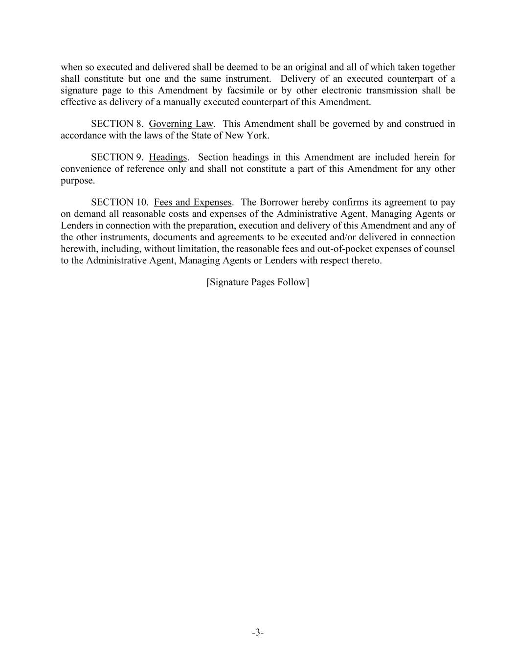 -3- when so executed and delivered shall be deemed to be an original and all of which taken together shall constitute but one and the same instrument. Delivery of an executed counterpart of a signature page to this Amendment by facsimile or by other electronic transmission shall be effective as delivery of a manually executed counterpart of this Amendment. SECTION 8. Governing Law. This Amendment shall be governed by and construed in accordance with the laws of the State of New York. SECTION 9. Headings. Section headings in this Amendment are included herein for convenience of reference only and shall not constitute a part of this Amendment for any other purpose. SECTION 10. Fees and Expenses. The Borrower hereby confirms its agreement to pay on demand all reasonable costs and expenses of the Administrative Agent, Managing Agents or Lenders in connection with the preparation, execution and delivery of this Amendment and any of the other instruments, documents and agreements to be executed and/or delivered in connection herewith, including, without limitation, the reasonable fees and out-of-pocket expenses of counsel to the Administrative Agent, Managing Agents or Lenders with respect thereto. [Signature Pages Follow]
