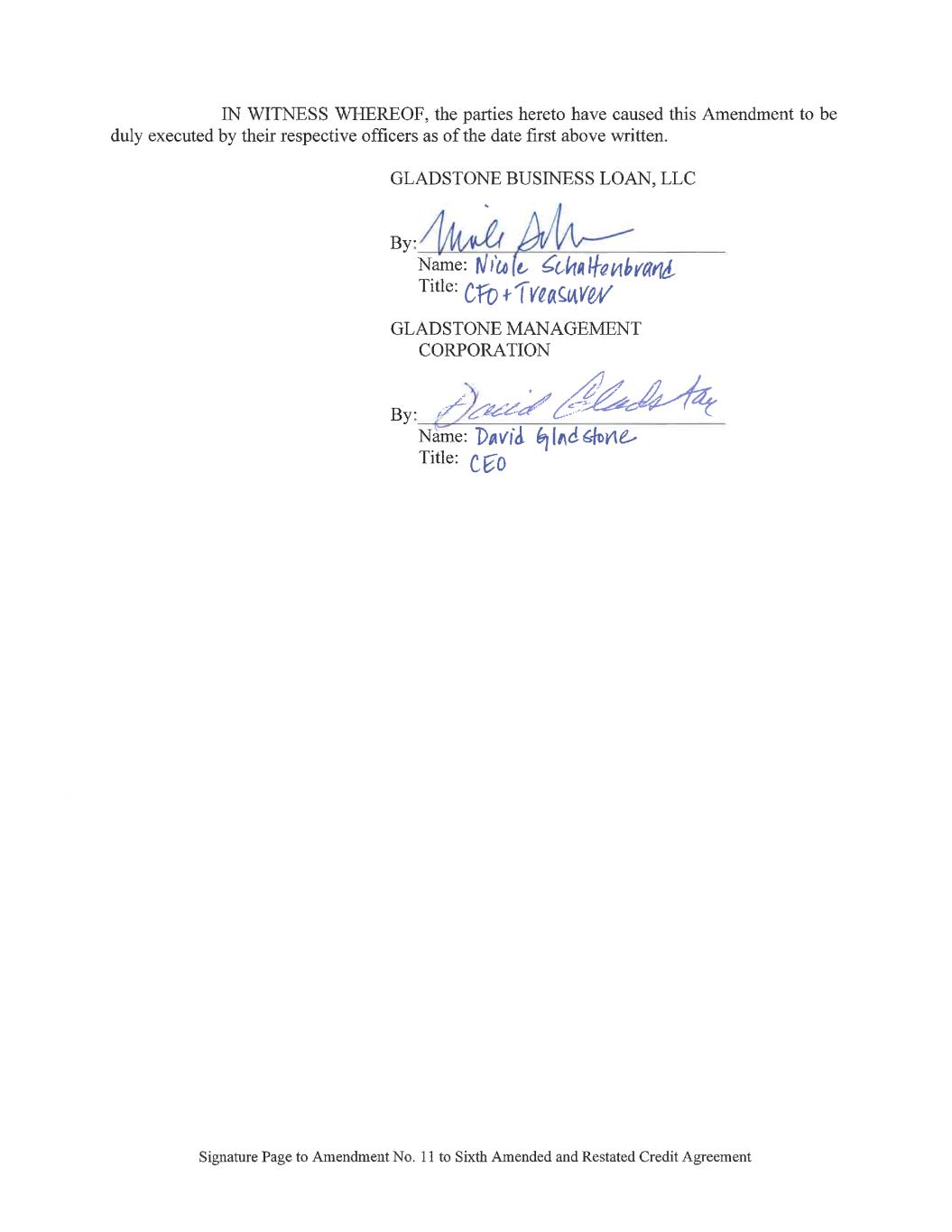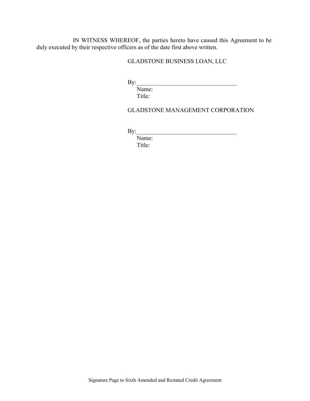 IN WITNESS WHEREOF, the parties hereto have caused this Agreement to be duly executed by their respective officers as of the date first above written. GLADSTONE BUSINESS LOAN, LLC By:_________________________________ Name: Title: GLADSTONE MANAGEMENT CORPORATION By:_________________________________ Name: Title: Signature Page to Sixth Amended and Restated Credit Agreement