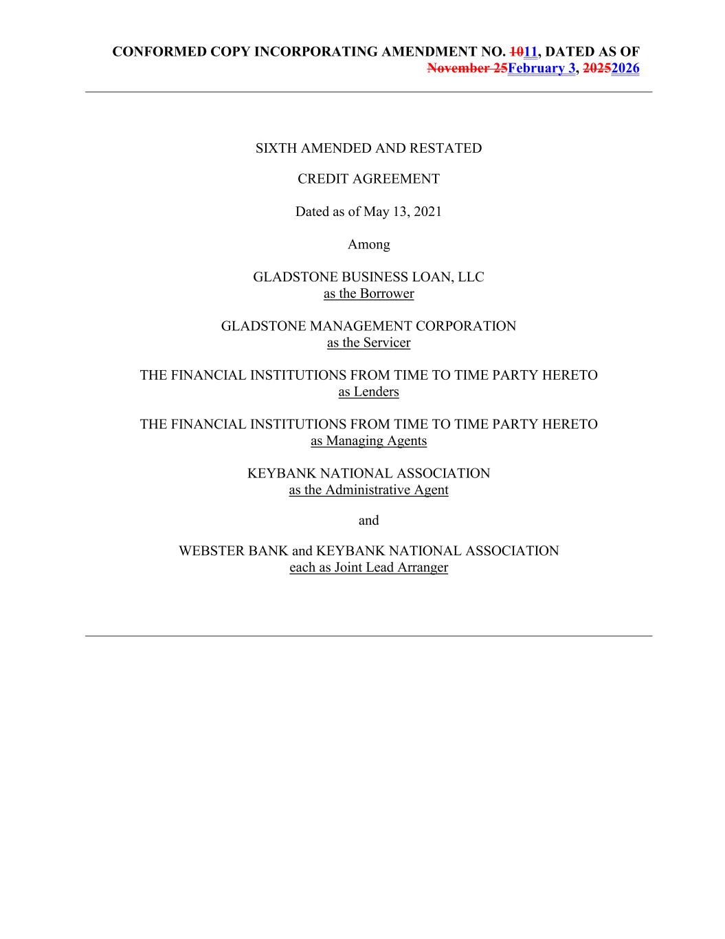 CONFORMED COPY INCORPORATING AMENDMENT NO. 1011, DATED AS OF November 25February 3, 20252026 SIXTH AMENDED AND RESTATED CREDIT AGREEMENT Dated as of May 13, 2021 Among GLADSTONE BUSINESS LOAN, LLC as the Borrower GLADSTONE MANAGEMENT CORPORATION as the Servicer THE FINANCIAL INSTITUTIONS FROM TIME TO TIME PARTY HERETO as Lenders THE FINANCIAL INSTITUTIONS FROM TIME TO TIME PARTY HERETO as Managing Agents KEYBANK NATIONAL ASSOCIATION as the Administrative Agent and WEBSTER BANK and KEYBANK NATIONAL ASSOCIATION each as Joint Lead Arranger