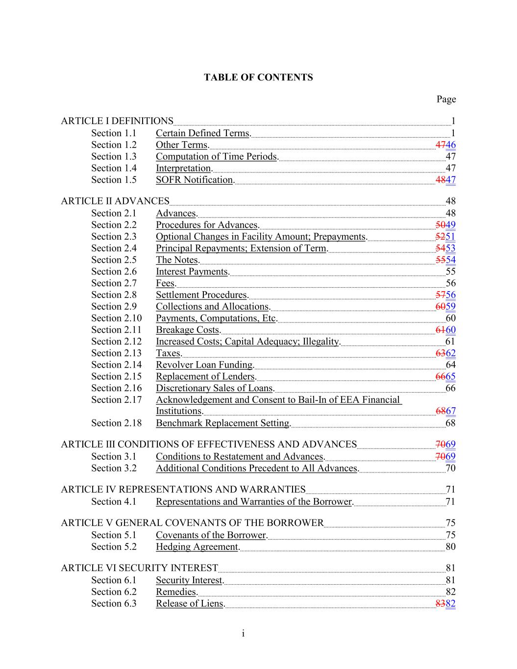 TABLE OF CONTENTS Page ARTICLE I DEFINITIONS 1 Section 1.1 Certain Defined Terms. 1 Section 1.2 Other Terms. 4746 Section 1.3 Computation of Time Periods. 47 Section 1.4 Interpretation. 47 Section 1.5 SOFR Notification. 4847 ARTICLE II ADVANCES 48 Section 2.1 Advances. 48 Section 2.2 Procedures for Advances. 5049 Section 2.3 Optional Changes in Facility Amount; Prepayments. 5251 Section 2.4 Principal Repayments; Extension of Term. 5453 Section 2.5 The Notes. 5554 Section 2.6 Interest Payments. 55 Section 2.7 Fees. 56 Section 2.8 Settlement Procedures. 5756 Section 2.9 Collections and Allocations. 6059 Section 2.10 Payments, Computations, Etc. 60 Section 2.11 Breakage Costs. 6160 Section 2.12 Increased Costs; Capital Adequacy; Illegality. 61 Section 2.13 Taxes. 6362 Section 2.14 Revolver Loan Funding. 64 Section 2.15 Replacement of Lenders. 6665 Section 2.16 Discretionary Sales of Loans. 66 Section 2.17 Acknowledgement and Consent to Bail-In of EEA Financial Institutions. 6867 Section 2.18 Benchmark Replacement Setting. 68 ARTICLE III CONDITIONS OF EFFECTIVENESS AND ADVANCES 7069 Section 3.1 Conditions to Restatement and Advances. 7069 Section 3.2 Additional Conditions Precedent to All Advances. 70 ARTICLE IV REPRESENTATIONS AND WARRANTIES 71 Section 4.1 Representations and Warranties of the Borrower. 71 ARTICLE V GENERAL COVENANTS OF THE BORROWER 75 Section 5.1 Covenants of the Borrower. 75 Section 5.2 Hedging Agreement. 80 ARTICLE VI SECURITY INTEREST 81 Section 6.1 Security Interest. 81 Section 6.2 Remedies. 82 Section 6.3 Release of Liens. 8382 i