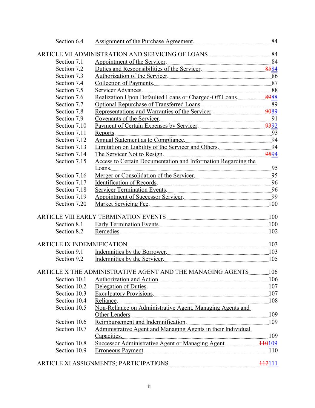 Section 6.4 Assignment of the Purchase Agreement. 84 ARTICLE VII ADMINISTRATION AND SERVICING OF LOANS 84 Section 7.1 Appointment of the Servicer. 84 Section 7.2 Duties and Responsibilities of the Servicer. 8584 Section 7.3 Authorization of the Servicer. 86 Section 7.4 Collection of Payments. 87 Section 7.5 Servicer Advances. 88 Section 7.6 Realization Upon Defaulted Loans or Charged-Off Loans. 8988 Section 7.7 Optional Repurchase of Transferred Loans. 89 Section 7.8 Representations and Warranties of the Servicer. 9089 Section 7.9 Covenants of the Servicer. 91 Section 7.10 Payment of Certain Expenses by Servicer. 9392 Section 7.11 Reports. 93 Section 7.12 Annual Statement as to Compliance. 94 Section 7.13 Limitation on Liability of the Servicer and Others. 94 Section 7.14 The Servicer Not to Resign. 9594 Section 7.15 Access to Certain Documentation and Information Regarding the Loans. 95 Section 7.16 Merger or Consolidation of the Servicer. 95 Section 7.17 Identification of Records. 96 Section 7.18 Servicer Termination Events. 96 Section 7.19 Appointment of Successor Servicer. 99 Section 7.20 Market Servicing Fee. 100 ARTICLE VIII EARLY TERMINATION EVENTS 100 Section 8.1 Early Termination Events. 100 Section 8.2 Remedies. 102 ARTICLE IX INDEMNIFICATION 103 Section 9.1 Indemnities by the Borrower. 103 Section 9.2 Indemnities by the Servicer. 105 ARTICLE X THE ADMINISTRATIVE AGENT AND THE MANAGING AGENTS 106 Section 10.1 Authorization and Action. 106 Section 10.2 Delegation of Duties. 107 Section 10.3 Exculpatory Provisions. 107 Section 10.4 Reliance. 108 Section 10.5 Non-Reliance on Administrative Agent, Managing Agents and Other Lenders. 109 Section 10.6 Reimbursement and Indemnification. 109 Section 10.7 Administrative Agent and Managing Agents in their Individual Capacities. 109 Section 10.8 Successor Administrative Agent or Managing Agent. 110109 Section 10.9 Erroneous Payment. 110 ARTICLE XI ASSIGNMENTS; PARTICIPATIONS 112111 ii