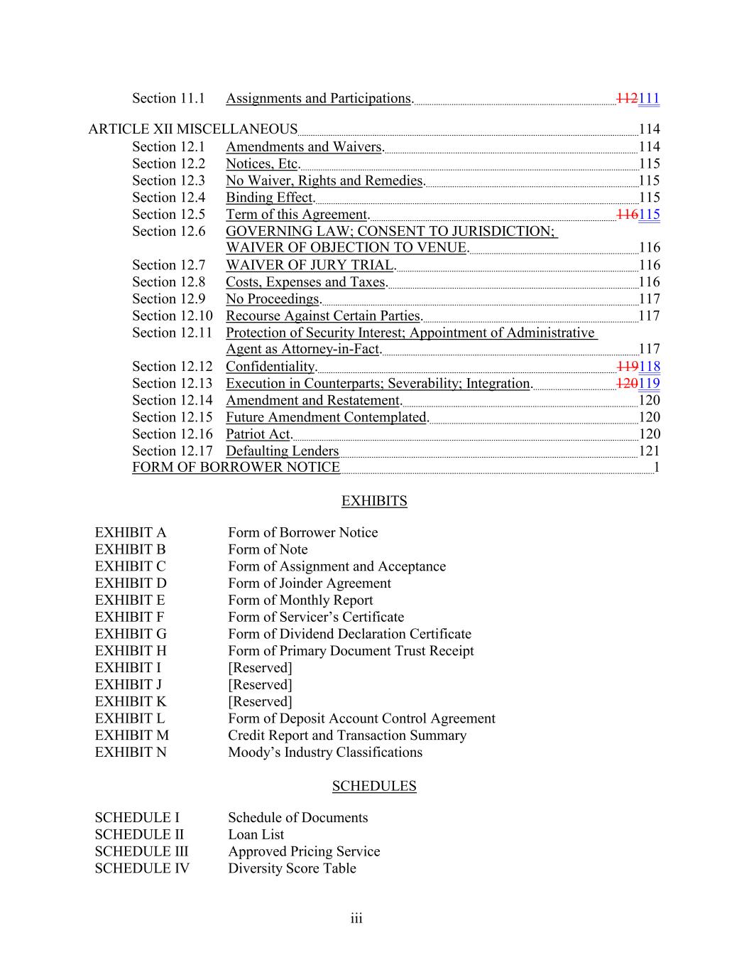 iii [Reserved] EXHIBIT B EXHIBIT J [Reserved] EXHIBIT E Form of Note EXHIBIT K Form of Monthly Report [Reserved] EXHIBIT A EXHIBIT L Form of Deposit Account Control Agreement EXHIBIT F EXHIBIT M Form of Servicer’s Certificate Credit Report and Transaction Summary EXHIBIT C EXHIBIT N Form of Borrower Notice Moody’s Industry Classifications EXHIBIT G SCHEDULES Form of Assignment and Acceptance SCHEDULE I Form of Dividend Declaration Certificate Schedule of Documents Section 11.1 Assignments and Participations. 112111 ARTICLE XII MISCELLANEOUS 114 Section 12.1 Amendments and Waivers. 114 Section 12.2 Notices, Etc. 115 Section 12.3 No Waiver, Rights and Remedies. 115 Section 12.4 Binding Effect. 115 Section 12.5 Term of this Agreement. 116115 Section 12.6 GOVERNING LAW; CONSENT TO JURISDICTION; WAIVER OF OBJECTION TO VENUE. 116 Section 12.7 WAIVER OF JURY TRIAL. 116 Section 12.8 Costs, Expenses and Taxes. 116 Section 12.9 No Proceedings. 117 Section 12.10 Recourse Against Certain Parties. 117 Section 12.11 Protection of Security Interest; Appointment of Administrative Agent as Attorney-in-Fact. 117 Section 12.12 Confidentiality. 119118 Section 12.13 Execution in Counterparts; Severability; Integration. 120119 Section 12.14 Amendment and Restatement. 120 Section 12.15 Future Amendment Contemplated. 120 Section 12.16 Patriot Act. 120 Section 12.17 Defaulting Lenders 121 FORM OF BORROWER NOTICE 1 EXHIBITS SCHEDULE II Loan List EXHIBIT H SCHEDULE III Form of Primary Document Trust Receipt Approved Pricing Service EXHIBIT D SCHEDULE IV Diversity Score Table EXHIBIT I Form of Joinder Agreement