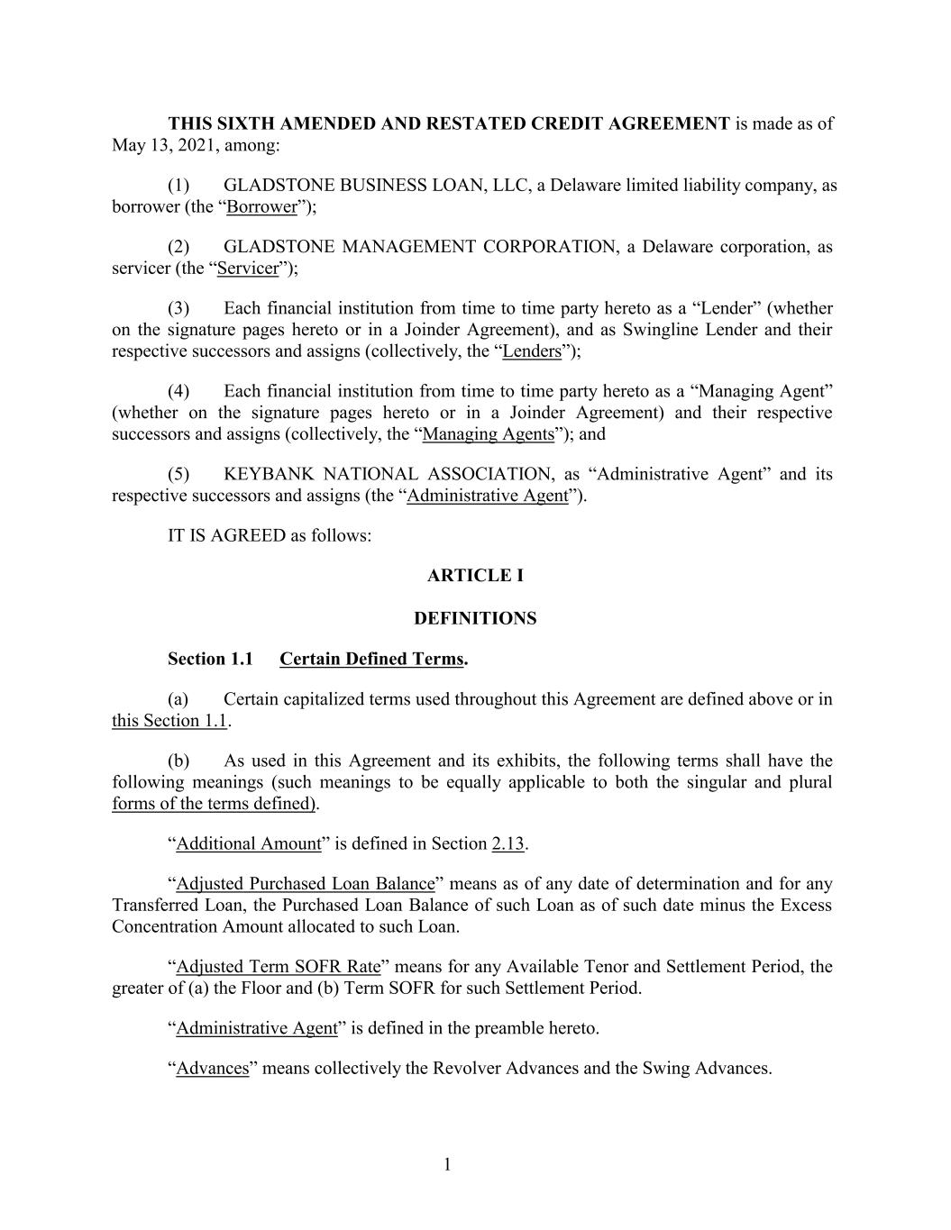 THIS SIXTH AMENDED AND RESTATED CREDIT AGREEMENT is made as of May 13, 2021, among: (1) GLADSTONE BUSINESS LOAN, LLC, a Delaware limited liability company, as borrower (the “Borrower”); (2) GLADSTONE MANAGEMENT CORPORATION, a Delaware corporation, as servicer (the “Servicer”); (3) Each financial institution from time to time party hereto as a “Lender” (whether on the signature pages hereto or in a Joinder Agreement), and as Swingline Lender and their respective successors and assigns (collectively, the “Lenders”); (4) Each financial institution from time to time party hereto as a “Managing Agent” (whether on the signature pages hereto or in a Joinder Agreement) and their respective successors and assigns (collectively, the “Managing Agents”); and (5) KEYBANK NATIONAL ASSOCIATION, as “Administrative Agent” and its respective successors and assigns (the “Administrative Agent”). IT IS AGREED as follows: ARTICLE I DEFINITIONS Section 1.1 Certain Defined Terms. (a) Certain capitalized terms used throughout this Agreement are defined above or in this Section 1.1. (b) As used in this Agreement and its exhibits, the following terms shall have the following meanings (such meanings to be equally applicable to both the singular and plural forms of the terms defined). “Additional Amount” is defined in Section 2.13. “Adjusted Purchased Loan Balance” means as of any date of determination and for any Transferred Loan, the Purchased Loan Balance of such Loan as of such date minus the Excess Concentration Amount allocated to such Loan. “Adjusted Term SOFR Rate” means for any Available Tenor and Settlement Period, the greater of (a) the Floor and (b) Term SOFR for such Settlement Period. “Administrative Agent” is defined in the preamble hereto. “Advances” means collectively the Revolver Advances and the Swing Advances. 1