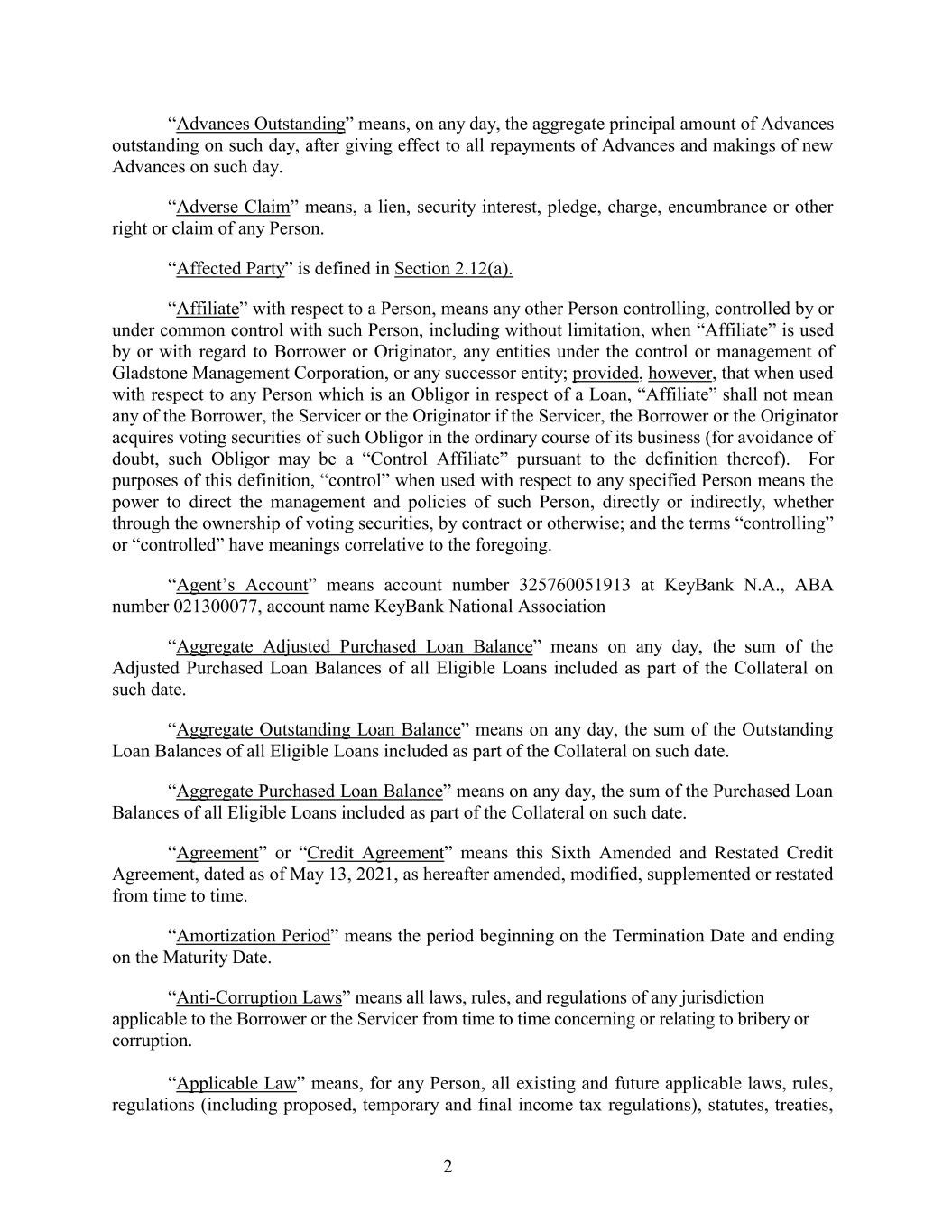 “Advances Outstanding” means, on any day, the aggregate principal amount of Advances outstanding on such day, after giving effect to all repayments of Advances and makings of new Advances on such day. “Adverse Claim” means, a lien, security interest, pledge, charge, encumbrance or other right or claim of any Person. “Affected Party” is defined in Section 2.12(a). “Affiliate” with respect to a Person, means any other Person controlling, controlled by or under common control with such Person, including without limitation, when “Affiliate” is used by or with regard to Borrower or Originator, any entities under the control or management of Gladstone Management Corporation, or any successor entity; provided, however, that when used with respect to any Person which is an Obligor in respect of a Loan, “Affiliate” shall not mean any of the Borrower, the Servicer or the Originator if the Servicer, the Borrower or the Originator acquires voting securities of such Obligor in the ordinary course of its business (for avoidance of doubt, such Obligor may be a “Control Affiliate” pursuant to the definition thereof). For purposes of this definition, “control” when used with respect to any specified Person means the power to direct the management and policies of such Person, directly or indirectly, whether through the ownership of voting securities, by contract or otherwise; and the terms “controlling” or “controlled” have meanings correlative to the foregoing. “Agent’s Account” means account number 325760051913 at KeyBank N.A., ABA number 021300077, account name KeyBank National Association “Aggregate Adjusted Purchased Loan Balance” means on any day, the sum of the Adjusted Purchased Loan Balances of all Eligible Loans included as part of the Collateral on such date. “Aggregate Outstanding Loan Balance” means on any day, the sum of the Outstanding Loan Balances of all Eligible Loans included as part of the Collateral on such date. “Aggregate Purchased Loan Balance” means on any day, the sum of the Purchased Loan Balances of all Eligible Loans included as part of the Collateral on such date. “Agreement” or “Credit Agreement” means this Sixth Amended and Restated Credit Agreement, dated as of May 13, 2021, as hereafter amended, modified, supplemented or restated from time to time. “Amortization Period” means the period beginning on the Termination Date and ending on the Maturity Date. “Anti-Corruption Laws” means all laws, rules, and regulations of any jurisdiction applicable to the Borrower or the Servicer from time to time concerning or relating to bribery or corruption. “Applicable Law” means, for any Person, all existing and future applicable laws, rules, regulations (including proposed, temporary and final income tax regulations), statutes, treaties, 2
