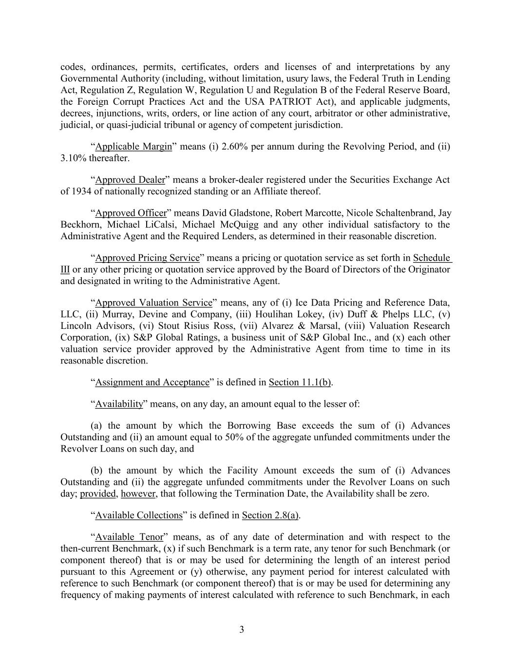 codes, ordinances, permits, certificates, orders and licenses of and interpretations by any Governmental Authority (including, without limitation, usury laws, the Federal Truth in Lending Act, Regulation Z, Regulation W, Regulation U and Regulation B of the Federal Reserve Board, the Foreign Corrupt Practices Act and the USA PATRIOT Act), and applicable judgments, decrees, injunctions, writs, orders, or line action of any court, arbitrator or other administrative, judicial, or quasi-judicial tribunal or agency of competent jurisdiction. “Applicable Margin” means (i) 2.60% per annum during the Revolving Period, and (ii) 3.10% thereafter. “Approved Dealer” means a broker-dealer registered under the Securities Exchange Act of 1934 of nationally recognized standing or an Affiliate thereof. “Approved Officer” means David Gladstone, Robert Marcotte, Nicole Schaltenbrand, Jay Beckhorn, Michael LiCalsi, Michael McQuigg and any other individual satisfactory to the Administrative Agent and the Required Lenders, as determined in their reasonable discretion. “Approved Pricing Service” means a pricing or quotation service as set forth in Schedule III or any other pricing or quotation service approved by the Board of Directors of the Originator and designated in writing to the Administrative Agent. “Approved Valuation Service” means, any of (i) Ice Data Pricing and Reference Data, LLC, (ii) Murray, Devine and Company, (iii) Houlihan Lokey, (iv) Duff & Phelps LLC, (v) Lincoln Advisors, (vi) Stout Risius Ross, (vii) Alvarez & Marsal, (viii) Valuation Research Corporation, (ix) S&P Global Ratings, a business unit of S&P Global Inc., and (x) each other valuation service provider approved by the Administrative Agent from time to time in its reasonable discretion. “Assignment and Acceptance” is defined in Section 11.1(b). “Availability” means, on any day, an amount equal to the lesser of: (a) the amount by which the Borrowing Base exceeds the sum of (i) Advances Outstanding and (ii) an amount equal to 50% of the aggregate unfunded commitments under the Revolver Loans on such day, and (b) the amount by which the Facility Amount exceeds the sum of (i) Advances Outstanding and (ii) the aggregate unfunded commitments under the Revolver Loans on such day; provided, however, that following the Termination Date, the Availability shall be zero. “Available Collections” is defined in Section 2.8(a). “Available Tenor” means, as of any date of determination and with respect to the then-current Benchmark, (x) if such Benchmark is a term rate, any tenor for such Benchmark (or component thereof) that is or may be used for determining the length of an interest period pursuant to this Agreement or (y) otherwise, any payment period for interest calculated with reference to such Benchmark (or component thereof) that is or may be used for determining any frequency of making payments of interest calculated with reference to such Benchmark, in each 3