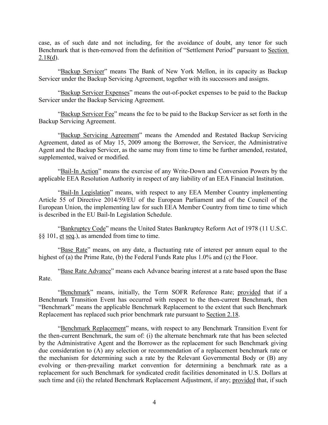 case, as of such date and not including, for the avoidance of doubt, any tenor for such Benchmark that is then-removed from the definition of “Settlement Period” pursuant to Section 2.18(d). “Backup Servicer” means The Bank of New York Mellon, in its capacity as Backup Servicer under the Backup Servicing Agreement, together with its successors and assigns. “Backup Servicer Expenses” means the out-of-pocket expenses to be paid to the Backup Servicer under the Backup Servicing Agreement. “Backup Servicer Fee” means the fee to be paid to the Backup Servicer as set forth in the Backup Servicing Agreement. “Backup Servicing Agreement” means the Amended and Restated Backup Servicing Agreement, dated as of May 15, 2009 among the Borrower, the Servicer, the Administrative Agent and the Backup Servicer, as the same may from time to time be further amended, restated, supplemented, waived or modified. “Bail-In Action” means the exercise of any Write-Down and Conversion Powers by the applicable EEA Resolution Authority in respect of any liability of an EEA Financial Institution. “Bail-In Legislation” means, with respect to any EEA Member Country implementing Article 55 of Directive 2014/59/EU of the European Parliament and of the Council of the European Union, the implementing law for such EEA Member Country from time to time which is described in the EU Bail-In Legislation Schedule. “Bankruptcy Code” means the United States Bankruptcy Reform Act of 1978 (11 U.S.C. §§ 101, et seq.), as amended from time to time. “Base Rate” means, on any date, a fluctuating rate of interest per annum equal to the highest of (a) the Prime Rate, (b) the Federal Funds Rate plus 1.0% and (c) the Floor. “Base Rate Advance” means each Advance bearing interest at a rate based upon the Base Rate. “Benchmark” means, initially, the Term SOFR Reference Rate; provided that if a Benchmark Transition Event has occurred with respect to the then-current Benchmark, then “Benchmark” means the applicable Benchmark Replacement to the extent that such Benchmark Replacement has replaced such prior benchmark rate pursuant to Section 2.18. “Benchmark Replacement” means, with respect to any Benchmark Transition Event for the then-current Benchmark, the sum of: (i) the alternate benchmark rate that has been selected by the Administrative Agent and the Borrower as the replacement for such Benchmark giving due consideration to (A) any selection or recommendation of a replacement benchmark rate or the mechanism for determining such a rate by the Relevant Governmental Body or (B) any evolving or then-prevailing market convention for determining a benchmark rate as a replacement for such Benchmark for syndicated credit facilities denominated in U.S. Dollars at such time and (ii) the related Benchmark Replacement Adjustment, if any; provided that, if such 4