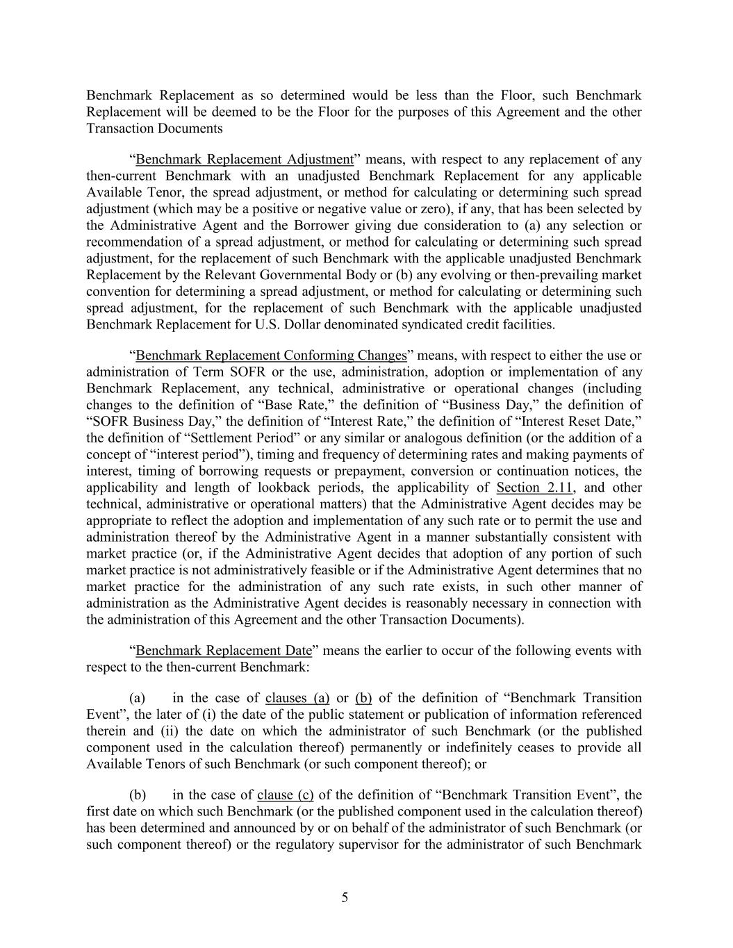 Benchmark Replacement as so determined would be less than the Floor, such Benchmark Replacement will be deemed to be the Floor for the purposes of this Agreement and the other Transaction Documents “Benchmark Replacement Adjustment” means, with respect to any replacement of any then-current Benchmark with an unadjusted Benchmark Replacement for any applicable Available Tenor, the spread adjustment, or method for calculating or determining such spread adjustment (which may be a positive or negative value or zero), if any, that has been selected by the Administrative Agent and the Borrower giving due consideration to (a) any selection or recommendation of a spread adjustment, or method for calculating or determining such spread adjustment, for the replacement of such Benchmark with the applicable unadjusted Benchmark Replacement by the Relevant Governmental Body or (b) any evolving or then-prevailing market convention for determining a spread adjustment, or method for calculating or determining such spread adjustment, for the replacement of such Benchmark with the applicable unadjusted Benchmark Replacement for U.S. Dollar denominated syndicated credit facilities. “Benchmark Replacement Conforming Changes” means, with respect to either the use or administration of Term SOFR or the use, administration, adoption or implementation of any Benchmark Replacement, any technical, administrative or operational changes (including changes to the definition of “Base Rate,” the definition of “Business Day,” the definition of “SOFR Business Day,” the definition of “Interest Rate,” the definition of “Interest Reset Date,” the definition of “Settlement Period” or any similar or analogous definition (or the addition of a concept of “interest period”), timing and frequency of determining rates and making payments of interest, timing of borrowing requests or prepayment, conversion or continuation notices, the applicability and length of lookback periods, the applicability of Section 2.11, and other technical, administrative or operational matters) that the Administrative Agent decides may be appropriate to reflect the adoption and implementation of any such rate or to permit the use and administration thereof by the Administrative Agent in a manner substantially consistent with market practice (or, if the Administrative Agent decides that adoption of any portion of such market practice is not administratively feasible or if the Administrative Agent determines that no market practice for the administration of any such rate exists, in such other manner of administration as the Administrative Agent decides is reasonably necessary in connection with the administration of this Agreement and the other Transaction Documents). “Benchmark Replacement Date” means the earlier to occur of the following events with respect to the then-current Benchmark: (a) in the case of clauses (a) or (b) of the definition of “Benchmark Transition Event”, the later of (i) the date of the public statement or publication of information referenced therein and (ii) the date on which the administrator of such Benchmark (or the published component used in the calculation thereof) permanently or indefinitely ceases to provide all Available Tenors of such Benchmark (or such component thereof); or (b) in the case of clause (c) of the definition of “Benchmark Transition Event”, the first date on which such Benchmark (or the published component used in the calculation thereof) has been determined and announced by or on behalf of the administrator of such Benchmark (or such component thereof) or the regulatory supervisor for the administrator of such Benchmark 5