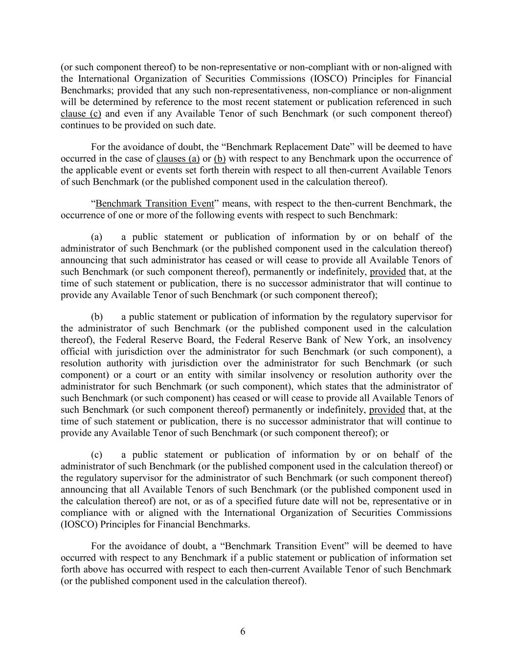 (or such component thereof) to be non-representative or non-compliant with or non-aligned with the International Organization of Securities Commissions (IOSCO) Principles for Financial Benchmarks; provided that any such non-representativeness, non-compliance or non-alignment will be determined by reference to the most recent statement or publication referenced in such clause (c) and even if any Available Tenor of such Benchmark (or such component thereof) continues to be provided on such date. For the avoidance of doubt, the “Benchmark Replacement Date” will be deemed to have occurred in the case of clauses (a) or (b) with respect to any Benchmark upon the occurrence of the applicable event or events set forth therein with respect to all then-current Available Tenors of such Benchmark (or the published component used in the calculation thereof). “Benchmark Transition Event” means, with respect to the then-current Benchmark, the occurrence of one or more of the following events with respect to such Benchmark: (a) a public statement or publication of information by or on behalf of the administrator of such Benchmark (or the published component used in the calculation thereof) announcing that such administrator has ceased or will cease to provide all Available Tenors of such Benchmark (or such component thereof), permanently or indefinitely, provided that, at the time of such statement or publication, there is no successor administrator that will continue to provide any Available Tenor of such Benchmark (or such component thereof); (b) a public statement or publication of information by the regulatory supervisor for the administrator of such Benchmark (or the published component used in the calculation thereof), the Federal Reserve Board, the Federal Reserve Bank of New York, an insolvency official with jurisdiction over the administrator for such Benchmark (or such component), a resolution authority with jurisdiction over the administrator for such Benchmark (or such component) or a court or an entity with similar insolvency or resolution authority over the administrator for such Benchmark (or such component), which states that the administrator of such Benchmark (or such component) has ceased or will cease to provide all Available Tenors of such Benchmark (or such component thereof) permanently or indefinitely, provided that, at the time of such statement or publication, there is no successor administrator that will continue to provide any Available Tenor of such Benchmark (or such component thereof); or (c) a public statement or publication of information by or on behalf of the administrator of such Benchmark (or the published component used in the calculation thereof) or the regulatory supervisor for the administrator of such Benchmark (or such component thereof) announcing that all Available Tenors of such Benchmark (or the published component used in the calculation thereof) are not, or as of a specified future date will not be, representative or in compliance with or aligned with the International Organization of Securities Commissions (IOSCO) Principles for Financial Benchmarks. For the avoidance of doubt, a “Benchmark Transition Event” will be deemed to have occurred with respect to any Benchmark if a public statement or publication of information set forth above has occurred with respect to each then-current Available Tenor of such Benchmark (or the published component used in the calculation thereof). 6
