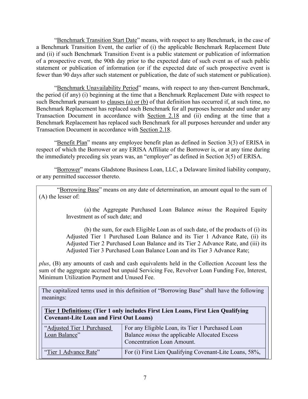 7 “Borrowing Base” means on any date of determination, an amount equal to the sum of (A) the lesser of: (a) the Aggregate Purchased Loan Balance minus the Required Equity Investment as of such date; and (b) the sum, for each Eligible Loan as of such date, of the products of (i) its Adjusted Tier 1 Purchased Loan Balance and its Tier 1 Advance Rate, (ii) its Adjusted Tier 2 Purchased Loan Balance and its Tier 2 Advance Rate, and (iii) its Adjusted Tier 3 Purchased Loan Balance Loan and its Tier 3 Advance Rate; plus, (B) any amounts of cash and cash equivalents held in the Collection Account less the sum of the aggregate accrued but unpaid Servicing Fee, Revolver Loan Funding Fee, Interest, Minimum Utilization Payment and Unused Fee. “Benchmark Transition Start Date” means, with respect to any Benchmark, in the case of a Benchmark Transition Event, the earlier of (i) the applicable Benchmark Replacement Date and (ii) if such Benchmark Transition Event is a public statement or publication of information of a prospective event, the 90th day prior to the expected date of such event as of such public statement or publication of information (or if the expected date of such prospective event is fewer than 90 days after such statement or publication, the date of such statement or publication). “Benchmark Unavailability Period” means, with respect to any then-current Benchmark, the period (if any) (i) beginning at the time that a Benchmark Replacement Date with respect to such Benchmark pursuant to clauses (a) or (b) of that definition has occurred if, at such time, no Benchmark Replacement has replaced such Benchmark for all purposes hereunder and under any Transaction Document in accordance with Section 2.18 and (ii) ending at the time that a Benchmark Replacement has replaced such Benchmark for all purposes hereunder and under any Transaction Document in accordance with Section 2.18. “Benefit Plan” means any employee benefit plan as defined in Section 3(3) of ERISA in respect of which the Borrower or any ERISA Affiliate of the Borrower is, or at any time during the immediately preceding six years was, an “employer” as defined in Section 3(5) of ERISA. “Borrower” means Gladstone Business Loan, LLC, a Delaware limited liability company, or any permitted successor thereto. The capitalized terms used in this definition of “Borrowing Base” shall have the following meanings: “Adjusted Tier 1 Purchased Loan Balance” For (i) First Lien Qualifying Covenant-Lite Loans, 58%, For any Eligible Loan, its Tier 1 Purchased Loan Balance minus the applicable Allocated Excess Concentration Loan Amount. Tier 1 Definitions: (Tier 1 only includes First Lien Loans, First Lien Qualifying Covenant-Lite Loan and First Out Loans) “Tier 1 Advance Rate”