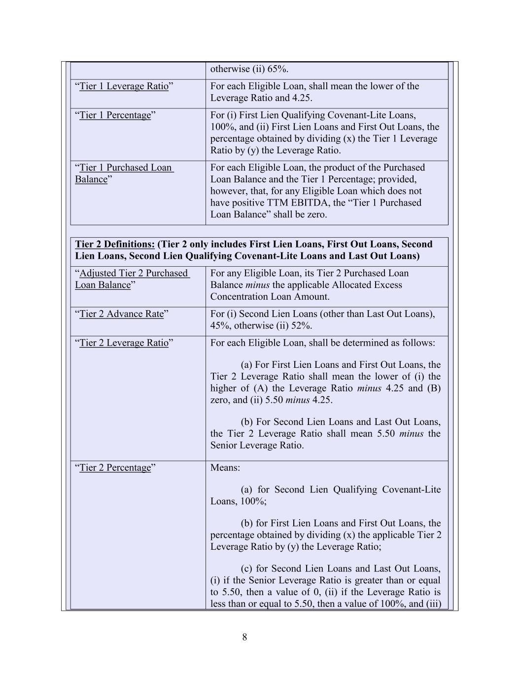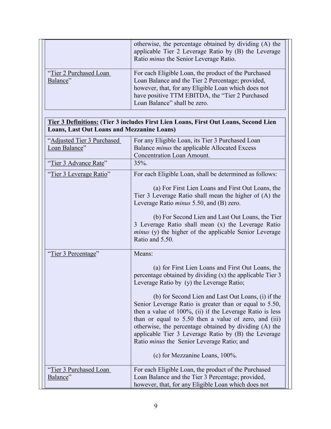 8 For (i) Second Lien Loans (other than Last Out Loans), 45%, otherwise (ii) 52%. otherwise (ii) 65%. “Tier 1 Purchased Loan Balance” “Tier 2 Leverage Ratio” For each Eligible Loan, shall mean the lower of the Leverage Ratio and 4.25. For each Eligible Loan, shall be determined as follows: (a) For First Lien Loans and First Out Loans, the Tier 2 Leverage Ratio shall mean the lower of (i) the higher of (A) the Leverage Ratio minus 4.25 and (B) zero, and (ii) 5.50 minus 4.25. (b) For Second Lien Loans and Last Out Loans, the Tier 2 Leverage Ratio shall mean 5.50 minus the Senior Leverage Ratio. For each Eligible Loan, the product of the Purchased Loan Balance and the Tier 1 Percentage; provided, however, that, for any Eligible Loan which does not have positive TTM EBITDA, the “Tier 1 Purchased Loan Balance” shall be zero. “Tier 2 Percentage” Means: (a) for Second Lien Qualifying Covenant-Lite Loans, 100%; (b) for First Lien Loans and First Out Loans, the percentage obtained by dividing (x) the applicable Tier 2 Leverage Ratio by (y) the Leverage Ratio; (c) for Second Lien Loans and Last Out Loans, (i) if the Senior Leverage Ratio is greater than or equal to 5.50, then a value of 0, (ii) if the Leverage Ratio is less than or equal to 5.50, then a value of 100%, and (iii) Tier 2 Definitions: (Tier 2 only includes First Lien Loans, First Out Loans, Second Lien Loans, Second Lien Qualifying Covenant-Lite Loans and Last Out Loans) “Tier 1 Percentage” “Adjusted Tier 2 Purchased Loan Balance” For any Eligible Loan, its Tier 2 Purchased Loan Balance minus the applicable Allocated Excess Concentration Loan Amount. For (i) First Lien Qualifying Covenant-Lite Loans, 100%, and (ii) First Lien Loans and First Out Loans, the percentage obtained by dividing (x) the Tier 1 Leverage Ratio by (y) the Leverage Ratio. “Tier 1 Leverage Ratio” “Tier 2 Advance Rate”