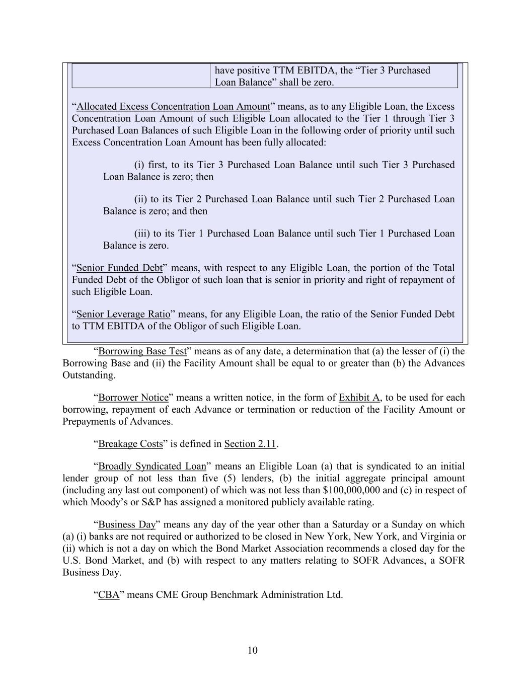 10 “Borrowing Base Test” means as of any date, a determination that (a) the lesser of (i) the Borrowing Base and (ii) the Facility Amount shall be equal to or greater than (b) the Advances Outstanding. “Borrower Notice” means a written notice, in the form of Exhibit A, to be used for each borrowing, repayment of each Advance or termination or reduction of the Facility Amount or Prepayments of Advances. “Breakage Costs” is defined in Section 2.11. “Broadly Syndicated Loan” means an Eligible Loan (a) that is syndicated to an initial lender group of not less than five (5) lenders, (b) the initial aggregate principal amount (including any last out component) of which was not less than $100,000,000 and (c) in respect of which Moody’s or S&P has assigned a monitored publicly available rating. “Business Day” means any day of the year other than a Saturday or a Sunday on which (a) (i) banks are not required or authorized to be closed in New York, New York, and Virginia or (ii) which is not a day on which the Bond Market Association recommends a closed day for the U.S. Bond Market, and (b) with respect to any matters relating to SOFR Advances, a SOFR Business Day. “CBA” means CME Group Benchmark Administration Ltd. “Allocated Excess Concentration Loan Amount” means, as to any Eligible Loan, the Excess Concentration Loan Amount of such Eligible Loan allocated to the Tier 1 through Tier 3 Purchased Loan Balances of such Eligible Loan in the following order of priority until such Excess Concentration Loan Amount has been fully allocated: (i) first, to its Tier 3 Purchased Loan Balance until such Tier 3 Purchased Loan Balance is zero; then (ii) to its Tier 2 Purchased Loan Balance until such Tier 2 Purchased Loan Balance is zero; and then (iii) to its Tier 1 Purchased Loan Balance until such Tier 1 Purchased Loan Balance is zero. “Senior Funded Debt” means, with respect to any Eligible Loan, the portion of the Total Funded Debt of the Obligor of such loan that is senior in priority and right of repayment of such Eligible Loan. “Senior Leverage Ratio” means, for any Eligible Loan, the ratio of the Senior Funded Debt to TTM EBITDA of the Obligor of such Eligible Loan. have positive TTM EBITDA, the “Tier 3 Purchased Loan Balance” shall be zero.