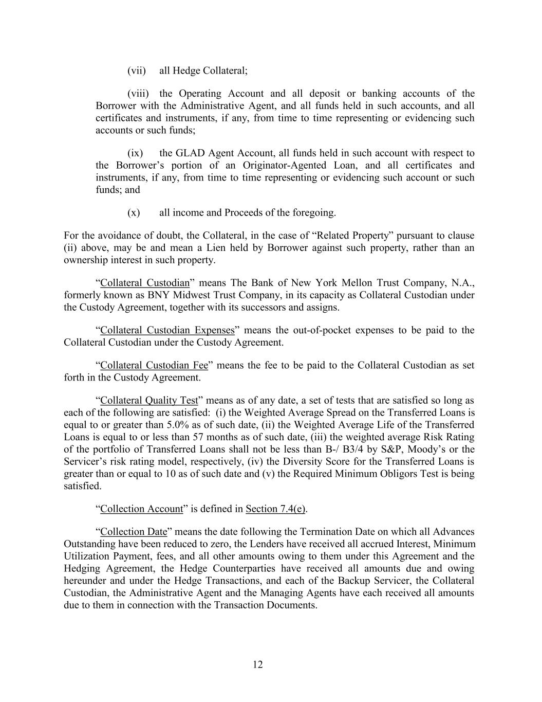 (vii) all Hedge Collateral; (viii) the Operating Account and all deposit or banking accounts of the Borrower with the Administrative Agent, and all funds held in such accounts, and all certificates and instruments, if any, from time to time representing or evidencing such accounts or such funds; (ix) the GLAD Agent Account, all funds held in such account with respect to the Borrower’s portion of an Originator-Agented Loan, and all certificates and instruments, if any, from time to time representing or evidencing such account or such funds; and (x) all income and Proceeds of the foregoing. For the avoidance of doubt, the Collateral, in the case of “Related Property” pursuant to clause (ii) above, may be and mean a Lien held by Borrower against such property, rather than an ownership interest in such property. “Collateral Custodian” means The Bank of New York Mellon Trust Company, N.A., formerly known as BNY Midwest Trust Company, in its capacity as Collateral Custodian under the Custody Agreement, together with its successors and assigns. “Collateral Custodian Expenses” means the out-of-pocket expenses to be paid to the Collateral Custodian under the Custody Agreement. “Collateral Custodian Fee” means the fee to be paid to the Collateral Custodian as set forth in the Custody Agreement. “Collateral Quality Test” means as of any date, a set of tests that are satisfied so long as each of the following are satisfied: (i) the Weighted Average Spread on the Transferred Loans is equal to or greater than 5.0% as of such date, (ii) the Weighted Average Life of the Transferred Loans is equal to or less than 57 months as of such date, (iii) the weighted average Risk Rating of the portfolio of Transferred Loans shall not be less than B-/ B3/4 by S&P, Moody’s or the Servicer’s risk rating model, respectively, (iv) the Diversity Score for the Transferred Loans is greater than or equal to 10 as of such date and (v) the Required Minimum Obligors Test is being satisfied. “Collection Account” is defined in Section 7.4(e). “Collection Date” means the date following the Termination Date on which all Advances Outstanding have been reduced to zero, the Lenders have received all accrued Interest, Minimum Utilization Payment, fees, and all other amounts owing to them under this Agreement and the Hedging Agreement, the Hedge Counterparties have received all amounts due and owing hereunder and under the Hedge Transactions, and each of the Backup Servicer, the Collateral Custodian, the Administrative Agent and the Managing Agents have each received all amounts due to them in connection with the Transaction Documents. 12