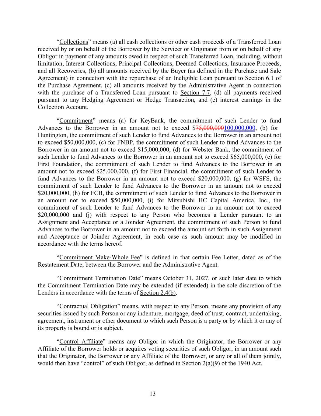 “Collections” means (a) all cash collections or other cash proceeds of a Transferred Loan received by or on behalf of the Borrower by the Servicer or Originator from or on behalf of any Obligor in payment of any amounts owed in respect of such Transferred Loan, including, without limitation, Interest Collections, Principal Collections, Deemed Collections, Insurance Proceeds, and all Recoveries, (b) all amounts received by the Buyer (as defined in the Purchase and Sale Agreement) in connection with the repurchase of an Ineligible Loan pursuant to Section 6.1 of the Purchase Agreement, (c) all amounts received by the Administrative Agent in connection with the purchase of a Transferred Loan pursuant to Section 7.7, (d) all payments received pursuant to any Hedging Agreement or Hedge Transaction, and (e) interest earnings in the Collection Account. “Commitment” means (a) for KeyBank, the commitment of such Lender to fund Advances to the Borrower in an amount not to exceed $75,000,000100,000,000, (b) for Huntington, the commitment of such Lender to fund Advances to the Borrower in an amount not to exceed $50,000,000, (c) for FNBP, the commitment of such Lender to fund Advances to the Borrower in an amount not to exceed $15,000,000, (d) for Webster Bank, the commitment of such Lender to fund Advances to the Borrower in an amount not to exceed $65,000,000, (e) for First Foundation, the commitment of such Lender to fund Advances to the Borrower in an amount not to exceed $25,000,000, (f) for First Financial, the commitment of such Lender to fund Advances to the Borrower in an amount not to exceed $20,000,000, (g) for WSFS, the commitment of such Lender to fund Advances to the Borrower in an amount not to exceed $20,000,000, (h) for FCB, the commitment of such Lender to fund Advances to the Borrower in an amount not to exceed $50,000,000, (i) for Mitsubishi HC Capital America, Inc., the commitment of such Lender to fund Advances to the Borrower in an amount not to exceed $20,000,000 and (j) with respect to any Person who becomes a Lender pursuant to an Assignment and Acceptance or a Joinder Agreement, the commitment of such Person to fund Advances to the Borrower in an amount not to exceed the amount set forth in such Assignment and Acceptance or Joinder Agreement, in each case as such amount may be modified in accordance with the terms hereof. “Commitment Make-Whole Fee” is defined in that certain Fee Letter, dated as of the Restatement Date, between the Borrower and the Administrative Agent. “Commitment Termination Date” means October 31, 2027, or such later date to which the Commitment Termination Date may be extended (if extended) in the sole discretion of the Lenders in accordance with the terms of Section 2.4(b). “Contractual Obligation” means, with respect to any Person, means any provision of any securities issued by such Person or any indenture, mortgage, deed of trust, contract, undertaking, agreement, instrument or other document to which such Person is a party or by which it or any of its property is bound or is subject. “Control Affiliate” means any Obligor in which the Originator, the Borrower or any Affiliate of the Borrower holds or acquires voting securities of such Obligor, in an amount such that the Originator, the Borrower or any Affiliate of the Borrower, or any or all of them jointly, would then have “control” of such Obligor, as defined in Section 2(a)(9) of the 1940 Act. 13