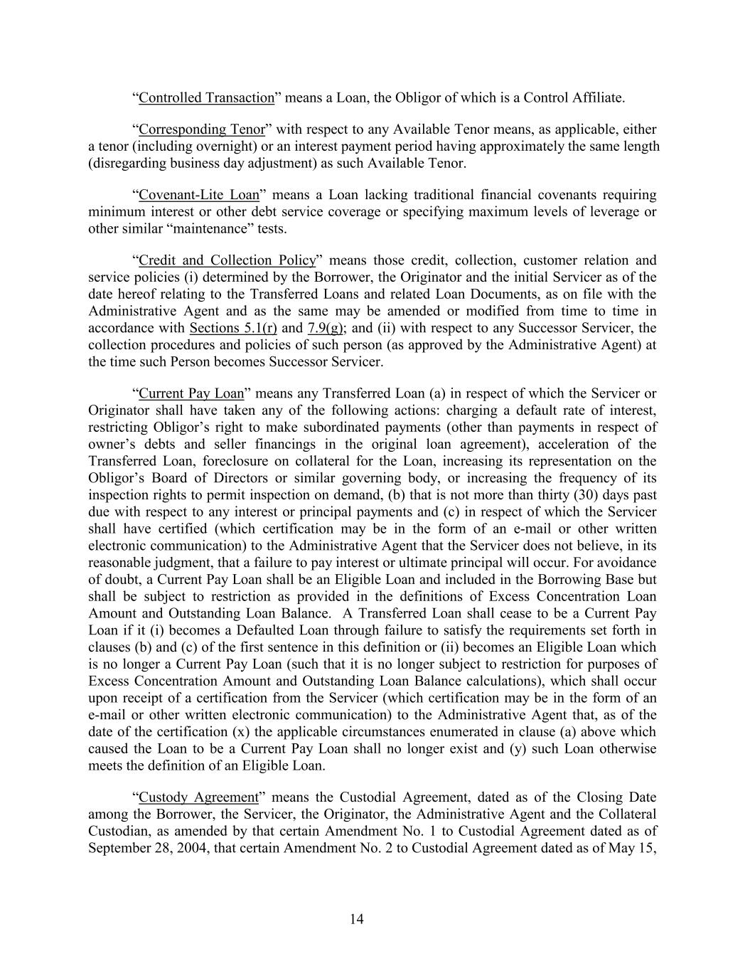 “Controlled Transaction” means a Loan, the Obligor of which is a Control Affiliate. “Corresponding Tenor” with respect to any Available Tenor means, as applicable, either a tenor (including overnight) or an interest payment period having approximately the same length (disregarding business day adjustment) as such Available Tenor. “Covenant-Lite Loan” means a Loan lacking traditional financial covenants requiring minimum interest or other debt service coverage or specifying maximum levels of leverage or other similar “maintenance” tests. “Credit and Collection Policy” means those credit, collection, customer relation and service policies (i) determined by the Borrower, the Originator and the initial Servicer as of the date hereof relating to the Transferred Loans and related Loan Documents, as on file with the Administrative Agent and as the same may be amended or modified from time to time in accordance with Sections 5.1(r) and 7.9(g); and (ii) with respect to any Successor Servicer, the collection procedures and policies of such person (as approved by the Administrative Agent) at the time such Person becomes Successor Servicer. “Current Pay Loan” means any Transferred Loan (a) in respect of which the Servicer or Originator shall have taken any of the following actions: charging a default rate of interest, restricting Obligor’s right to make subordinated payments (other than payments in respect of owner’s debts and seller financings in the original loan agreement), acceleration of the Transferred Loan, foreclosure on collateral for the Loan, increasing its representation on the Obligor’s Board of Directors or similar governing body, or increasing the frequency of its inspection rights to permit inspection on demand, (b) that is not more than thirty (30) days past due with respect to any interest or principal payments and (c) in respect of which the Servicer shall have certified (which certification may be in the form of an e-mail or other written electronic communication) to the Administrative Agent that the Servicer does not believe, in its reasonable judgment, that a failure to pay interest or ultimate principal will occur. For avoidance of doubt, a Current Pay Loan shall be an Eligible Loan and included in the Borrowing Base but shall be subject to restriction as provided in the definitions of Excess Concentration Loan Amount and Outstanding Loan Balance. A Transferred Loan shall cease to be a Current Pay Loan if it (i) becomes a Defaulted Loan through failure to satisfy the requirements set forth in clauses (b) and (c) of the first sentence in this definition or (ii) becomes an Eligible Loan which is no longer a Current Pay Loan (such that it is no longer subject to restriction for purposes of Excess Concentration Amount and Outstanding Loan Balance calculations), which shall occur upon receipt of a certification from the Servicer (which certification may be in the form of an e-mail or other written electronic communication) to the Administrative Agent that, as of the date of the certification (x) the applicable circumstances enumerated in clause (a) above which caused the Loan to be a Current Pay Loan shall no longer exist and (y) such Loan otherwise meets the definition of an Eligible Loan. “Custody Agreement” means the Custodial Agreement, dated as of the Closing Date among the Borrower, the Servicer, the Originator, the Administrative Agent and the Collateral Custodian, as amended by that certain Amendment No. 1 to Custodial Agreement dated as of September 28, 2004, that certain Amendment No. 2 to Custodial Agreement dated as of May 15, 14