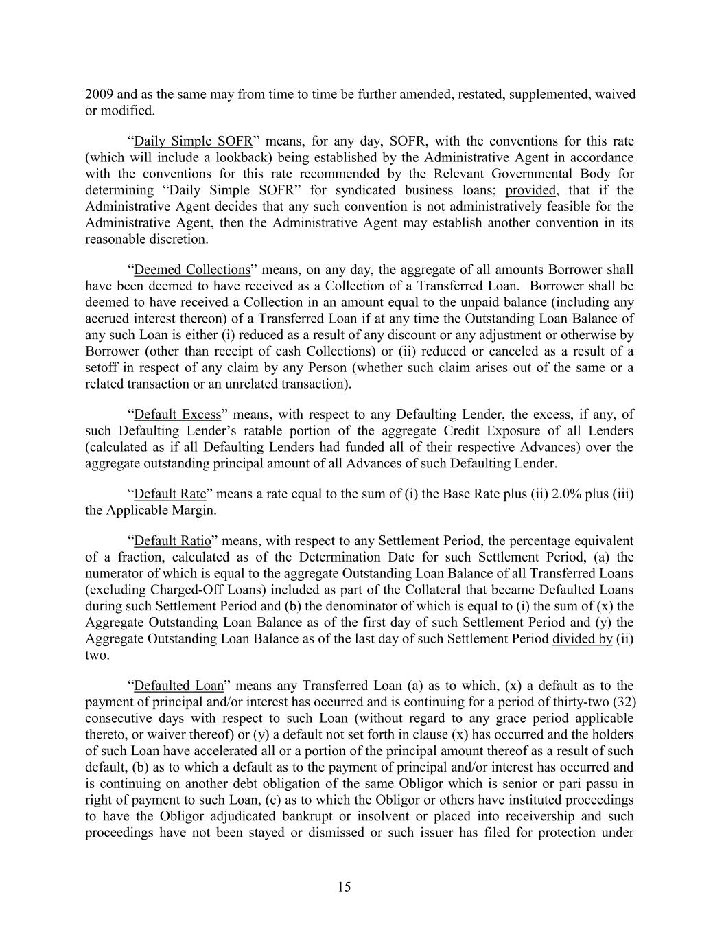 2009 and as the same may from time to time be further amended, restated, supplemented, waived or modified. “Daily Simple SOFR” means, for any day, SOFR, with the conventions for this rate (which will include a lookback) being established by the Administrative Agent in accordance with the conventions for this rate recommended by the Relevant Governmental Body for determining “Daily Simple SOFR” for syndicated business loans; provided, that if the Administrative Agent decides that any such convention is not administratively feasible for the Administrative Agent, then the Administrative Agent may establish another convention in its reasonable discretion. “Deemed Collections” means, on any day, the aggregate of all amounts Borrower shall have been deemed to have received as a Collection of a Transferred Loan. Borrower shall be deemed to have received a Collection in an amount equal to the unpaid balance (including any accrued interest thereon) of a Transferred Loan if at any time the Outstanding Loan Balance of any such Loan is either (i) reduced as a result of any discount or any adjustment or otherwise by Borrower (other than receipt of cash Collections) or (ii) reduced or canceled as a result of a setoff in respect of any claim by any Person (whether such claim arises out of the same or a related transaction or an unrelated transaction). “Default Excess” means, with respect to any Defaulting Lender, the excess, if any, of such Defaulting Lender’s ratable portion of the aggregate Credit Exposure of all Lenders (calculated as if all Defaulting Lenders had funded all of their respective Advances) over the aggregate outstanding principal amount of all Advances of such Defaulting Lender. “Default Rate” means a rate equal to the sum of (i) the Base Rate plus (ii) 2.0% plus (iii) the Applicable Margin. “Default Ratio” means, with respect to any Settlement Period, the percentage equivalent of a fraction, calculated as of the Determination Date for such Settlement Period, (a) the numerator of which is equal to the aggregate Outstanding Loan Balance of all Transferred Loans (excluding Charged-Off Loans) included as part of the Collateral that became Defaulted Loans during such Settlement Period and (b) the denominator of which is equal to (i) the sum of (x) the Aggregate Outstanding Loan Balance as of the first day of such Settlement Period and (y) the Aggregate Outstanding Loan Balance as of the last day of such Settlement Period divided by (ii) two. “Defaulted Loan” means any Transferred Loan (a) as to which, (x) a default as to the payment of principal and/or interest has occurred and is continuing for a period of thirty-two (32) consecutive days with respect to such Loan (without regard to any grace period applicable thereto, or waiver thereof) or (y) a default not set forth in clause (x) has occurred and the holders of such Loan have accelerated all or a portion of the principal amount thereof as a result of such default, (b) as to which a default as to the payment of principal and/or interest has occurred and is continuing on another debt obligation of the same Obligor which is senior or pari passu in right of payment to such Loan, (c) as to which the Obligor or others have instituted proceedings to have the Obligor adjudicated bankrupt or insolvent or placed into receivership and such proceedings have not been stayed or dismissed or such issuer has filed for protection under 15