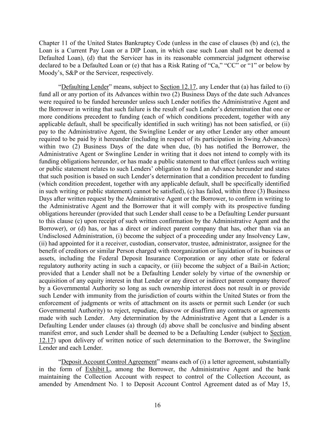 Chapter 11 of the United States Bankruptcy Code (unless in the case of clauses (b) and (c), the Loan is a Current Pay Loan or a DIP Loan, in which case such Loan shall not be deemed a Defaulted Loan), (d) that the Servicer has in its reasonable commercial judgment otherwise declared to be a Defaulted Loan or (e) that has a Risk Rating of “Ca,” “CC” or “1” or below by Moody’s, S&P or the Servicer, respectively. “Defaulting Lender” means, subject to Section 12.17, any Lender that (a) has failed to (i) fund all or any portion of its Advances within two (2) Business Days of the date such Advances were required to be funded hereunder unless such Lender notifies the Administrative Agent and the Borrower in writing that such failure is the result of such Lender’s determination that one or more conditions precedent to funding (each of which conditions precedent, together with any applicable default, shall be specifically identified in such writing) has not been satisfied, or (ii) pay to the Administrative Agent, the Swingline Lender or any other Lender any other amount required to be paid by it hereunder (including in respect of its participation in Swing Advances) within two (2) Business Days of the date when due, (b) has notified the Borrower, the Administrative Agent or Swingline Lender in writing that it does not intend to comply with its funding obligations hereunder, or has made a public statement to that effect (unless such writing or public statement relates to such Lenders’ obligation to fund an Advance hereunder and states that such position is based on such Lender’s determination that a condition precedent to funding (which condition precedent, together with any applicable default, shall be specifically identified in such writing or public statement) cannot be satisfied), (c) has failed, within three (3) Business Days after written request by the Administrative Agent or the Borrower, to confirm in writing to the Administrative Agent and the Borrower that it will comply with its prospective funding obligations hereunder (provided that such Lender shall cease to be a Defaulting Lender pursuant to this clause (c) upon receipt of such written confirmation by the Administrative Agent and the Borrower), or (d) has, or has a direct or indirect parent company that has, other than via an Undisclosed Administration, (i) become the subject of a proceeding under any Insolvency Law, (ii) had appointed for it a receiver, custodian, conservator, trustee, administrator, assignee for the benefit of creditors or similar Person charged with reorganization or liquidation of its business or assets, including the Federal Deposit Insurance Corporation or any other state or federal regulatory authority acting in such a capacity, or (iii) become the subject of a Bail-in Action; provided that a Lender shall not be a Defaulting Lender solely by virtue of the ownership or acquisition of any equity interest in that Lender or any direct or indirect parent company thereof by a Governmental Authority so long as such ownership interest does not result in or provide such Lender with immunity from the jurisdiction of courts within the United States or from the enforcement of judgments or writs of attachment on its assets or permit such Lender (or such Governmental Authority) to reject, repudiate, disavow or disaffirm any contracts or agreements made with such Lender. Any determination by the Administrative Agent that a Lender is a Defaulting Lender under clauses (a) through (d) above shall be conclusive and binding absent manifest error, and such Lender shall be deemed to be a Defaulting Lender (subject to Section 12.17) upon delivery of written notice of such determination to the Borrower, the Swingline Lender and each Lender. “Deposit Account Control Agreement” means each of (i) a letter agreement, substantially in the form of Exhibit L, among the Borrower, the Administrative Agent and the bank maintaining the Collection Account with respect to control of the Collection Account, as amended by Amendment No. 1 to Deposit Account Control Agreement dated as of May 15, 16
