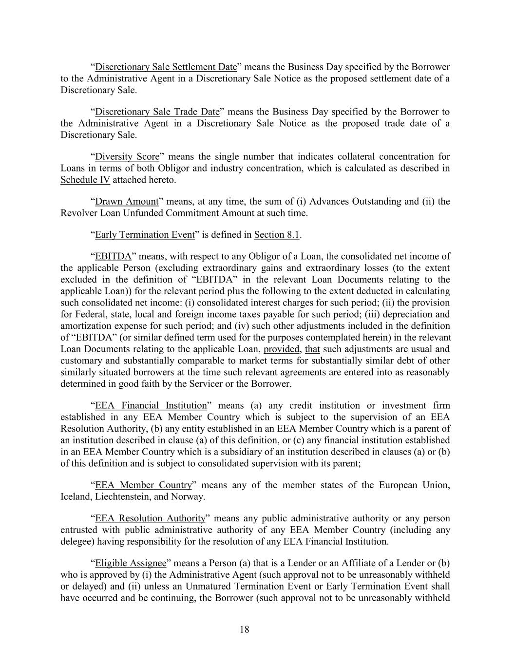 “Discretionary Sale Settlement Date” means the Business Day specified by the Borrower to the Administrative Agent in a Discretionary Sale Notice as the proposed settlement date of a Discretionary Sale. “Discretionary Sale Trade Date” means the Business Day specified by the Borrower to the Administrative Agent in a Discretionary Sale Notice as the proposed trade date of a Discretionary Sale. “Diversity Score” means the single number that indicates collateral concentration for Loans in terms of both Obligor and industry concentration, which is calculated as described in Schedule IV attached hereto. “Drawn Amount” means, at any time, the sum of (i) Advances Outstanding and (ii) the Revolver Loan Unfunded Commitment Amount at such time. “Early Termination Event” is defined in Section 8.1. “EBITDA” means, with respect to any Obligor of a Loan, the consolidated net income of the applicable Person (excluding extraordinary gains and extraordinary losses (to the extent excluded in the definition of “EBITDA” in the relevant Loan Documents relating to the applicable Loan)) for the relevant period plus the following to the extent deducted in calculating such consolidated net income: (i) consolidated interest charges for such period; (ii) the provision for Federal, state, local and foreign income taxes payable for such period; (iii) depreciation and amortization expense for such period; and (iv) such other adjustments included in the definition of “EBITDA” (or similar defined term used for the purposes contemplated herein) in the relevant Loan Documents relating to the applicable Loan, provided, that such adjustments are usual and customary and substantially comparable to market terms for substantially similar debt of other similarly situated borrowers at the time such relevant agreements are entered into as reasonably determined in good faith by the Servicer or the Borrower. “EEA Financial Institution” means (a) any credit institution or investment firm established in any EEA Member Country which is subject to the supervision of an EEA Resolution Authority, (b) any entity established in an EEA Member Country which is a parent of an institution described in clause (a) of this definition, or (c) any financial institution established in an EEA Member Country which is a subsidiary of an institution described in clauses (a) or (b) of this definition and is subject to consolidated supervision with its parent; “EEA Member Country” means any of the member states of the European Union, Iceland, Liechtenstein, and Norway. “EEA Resolution Authority” means any public administrative authority or any person entrusted with public administrative authority of any EEA Member Country (including any delegee) having responsibility for the resolution of any EEA Financial Institution. “Eligible Assignee” means a Person (a) that is a Lender or an Affiliate of a Lender or (b) who is approved by (i) the Administrative Agent (such approval not to be unreasonably withheld or delayed) and (ii) unless an Unmatured Termination Event or Early Termination Event shall have occurred and be continuing, the Borrower (such approval not to be unreasonably withheld 18