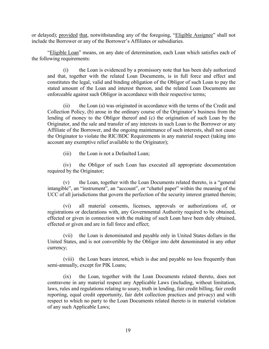 or delayed); provided that, notwithstanding any of the foregoing, “Eligible Assignee” shall not include the Borrower or any of the Borrower’s Affiliates or subsidiaries. “Eligible Loan” means, on any date of determination, each Loan which satisfies each of the following requirements: (i) the Loan is evidenced by a promissory note that has been duly authorized and that, together with the related Loan Documents, is in full force and effect and constitutes the legal, valid and binding obligation of the Obligor of such Loan to pay the stated amount of the Loan and interest thereon, and the related Loan Documents are enforceable against such Obligor in accordance with their respective terms; (ii) the Loan (a) was originated in accordance with the terms of the Credit and Collection Policy, (b) arose in the ordinary course of the Originator’s business from the lending of money to the Obligor thereof and (c) the origination of such Loan by the Originator, and the sale and transfer of any interests in such Loan to the Borrower or any Affiliate of the Borrower, and the ongoing maintenance of such interests, shall not cause the Originator to violate the RIC/BDC Requirements in any material respect (taking into account any exemptive relief available to the Originator); (iii) the Loan is not a Defaulted Loan; (iv) the Obligor of such Loan has executed all appropriate documentation required by the Originator; (v) the Loan, together with the Loan Documents related thereto, is a “general intangible”, an “instrument”, an “account”, or “chattel paper” within the meaning of the UCC of all jurisdictions that govern the perfection of the security interest granted therein; (vi) all material consents, licenses, approvals or authorizations of, or registrations or declarations with, any Governmental Authority required to be obtained, effected or given in connection with the making of such Loan have been duly obtained, effected or given and are in full force and effect; (vii) the Loan is denominated and payable only in United States dollars in the United States, and is not convertible by the Obligor into debt denominated in any other currency; (viii) the Loan bears interest, which is due and payable no less frequently than semi-annually, except for PIK Loans; (ix) the Loan, together with the Loan Documents related thereto, does not contravene in any material respect any Applicable Laws (including, without limitation, laws, rules and regulations relating to usury, truth in lending, fair credit billing, fair credit reporting, equal credit opportunity, fair debt collection practices and privacy) and with respect to which no party to the Loan Documents related thereto is in material violation of any such Applicable Laws; 19