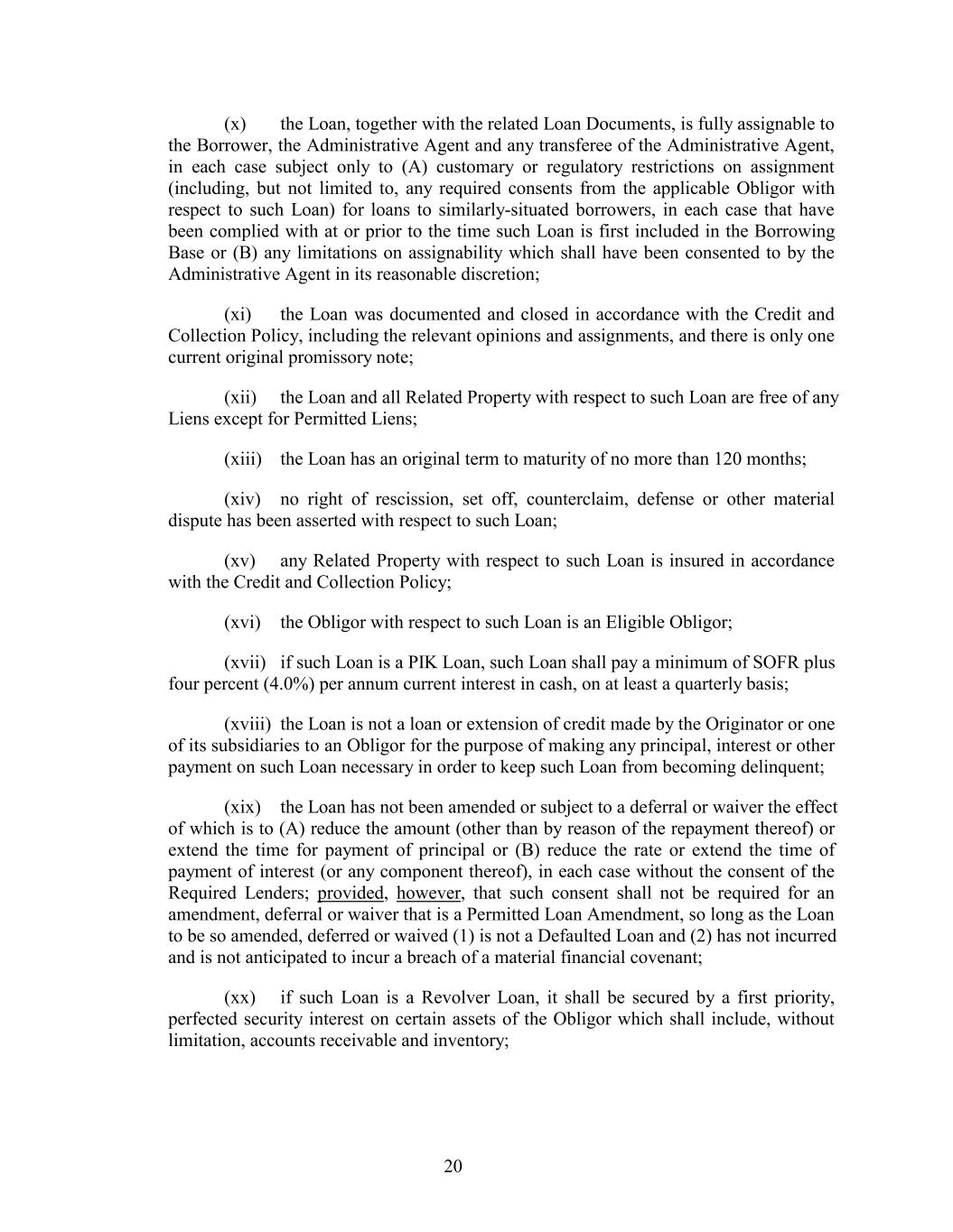 (x) the Loan, together with the related Loan Documents, is fully assignable to the Borrower, the Administrative Agent and any transferee of the Administrative Agent, in each case subject only to (A) customary or regulatory restrictions on assignment (including, but not limited to, any required consents from the applicable Obligor with respect to such Loan) for loans to similarly-situated borrowers, in each case that have been complied with at or prior to the time such Loan is first included in the Borrowing Base or (B) any limitations on assignability which shall have been consented to by the Administrative Agent in its reasonable discretion; (xi) the Loan was documented and closed in accordance with the Credit and Collection Policy, including the relevant opinions and assignments, and there is only one current original promissory note; (xii) the Loan and all Related Property with respect to such Loan are free of any Liens except for Permitted Liens; (xiii) the Loan has an original term to maturity of no more than 120 months; (xiv) no right of rescission, set off, counterclaim, defense or other material dispute has been asserted with respect to such Loan; (xv) any Related Property with respect to such Loan is insured in accordance with the Credit and Collection Policy; (xvi) the Obligor with respect to such Loan is an Eligible Obligor; (xvii) if such Loan is a PIK Loan, such Loan shall pay a minimum of SOFR plus four percent (4.0%) per annum current interest in cash, on at least a quarterly basis; (xviii) the Loan is not a loan or extension of credit made by the Originator or one of its subsidiaries to an Obligor for the purpose of making any principal, interest or other payment on such Loan necessary in order to keep such Loan from becoming delinquent; (xix) the Loan has not been amended or subject to a deferral or waiver the effect of which is to (A) reduce the amount (other than by reason of the repayment thereof) or extend the time for payment of principal or (B) reduce the rate or extend the time of payment of interest (or any component thereof), in each case without the consent of the Required Lenders; provided, however, that such consent shall not be required for an amendment, deferral or waiver that is a Permitted Loan Amendment, so long as the Loan to be so amended, deferred or waived (1) is not a Defaulted Loan and (2) has not incurred and is not anticipated to incur a breach of a material financial covenant; (xx) if such Loan is a Revolver Loan, it shall be secured by a first priority, perfected security interest on certain assets of the Obligor which shall include, without limitation, accounts receivable and inventory; 20