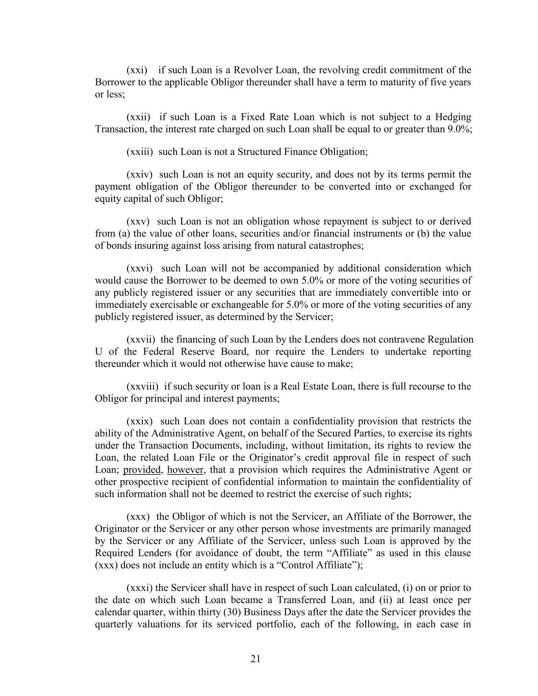 (xxi) if such Loan is a Revolver Loan, the revolving credit commitment of the Borrower to the applicable Obligor thereunder shall have a term to maturity of five years or less; (xxii) if such Loan is a Fixed Rate Loan which is not subject to a Hedging Transaction, the interest rate charged on such Loan shall be equal to or greater than 9.0%; (xxiii) such Loan is not a Structured Finance Obligation; (xxiv) such Loan is not an equity security, and does not by its terms permit the payment obligation of the Obligor thereunder to be converted into or exchanged for equity capital of such Obligor; (xxv) such Loan is not an obligation whose repayment is subject to or derived from (a) the value of other loans, securities and/or financial instruments or (b) the value of bonds insuring against loss arising from natural catastrophes; (xxvi) such Loan will not be accompanied by additional consideration which would cause the Borrower to be deemed to own 5.0% or more of the voting securities of any publicly registered issuer or any securities that are immediately convertible into or immediately exercisable or exchangeable for 5.0% or more of the voting securities of any publicly registered issuer, as determined by the Servicer; (xxvii) the financing of such Loan by the Lenders does not contravene Regulation U of the Federal Reserve Board, nor require the Lenders to undertake reporting thereunder which it would not otherwise have cause to make; (xxviii) if such security or loan is a Real Estate Loan, there is full recourse to the Obligor for principal and interest payments; (xxix) such Loan does not contain a confidentiality provision that restricts the ability of the Administrative Agent, on behalf of the Secured Parties, to exercise its rights under the Transaction Documents, including, without limitation, its rights to review the Loan, the related Loan File or the Originator’s credit approval file in respect of such Loan; provided, however, that a provision which requires the Administrative Agent or other prospective recipient of confidential information to maintain the confidentiality of such information shall not be deemed to restrict the exercise of such rights; (xxx) the Obligor of which is not the Servicer, an Affiliate of the Borrower, the Originator or the Servicer or any other person whose investments are primarily managed by the Servicer or any Affiliate of the Servicer, unless such Loan is approved by the Required Lenders (for avoidance of doubt, the term “Affiliate” as used in this clause (xxx) does not include an entity which is a “Control Affiliate”); (xxxi) the Servicer shall have in respect of such Loan calculated, (i) on or prior to the date on which such Loan became a Transferred Loan, and (ii) at least once per calendar quarter, within thirty (30) Business Days after the date the Servicer provides the quarterly valuations for its serviced portfolio, each of the following, in each case in 21
