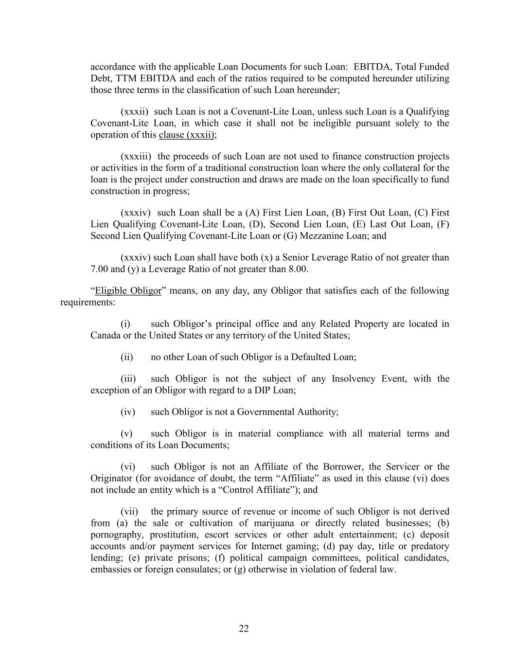 accordance with the applicable Loan Documents for such Loan: EBITDA, Total Funded Debt, TTM EBITDA and each of the ratios required to be computed hereunder utilizing those three terms in the classification of such Loan hereunder; (xxxii) such Loan is not a Covenant-Lite Loan, unless such Loan is a Qualifying Covenant-Lite Loan, in which case it shall not be ineligible pursuant solely to the operation of this clause (xxxii); (xxxiii) the proceeds of such Loan are not used to finance construction projects or activities in the form of a traditional construction loan where the only collateral for the loan is the project under construction and draws are made on the loan specifically to fund construction in progress; (xxxiv) such Loan shall be a (A) First Lien Loan, (B) First Out Loan, (C) First Lien Qualifying Covenant-Lite Loan, (D), Second Lien Loan, (E) Last Out Loan, (F) Second Lien Qualifying Covenant-Lite Loan or (G) Mezzanine Loan; and (xxxiv) such Loan shall have both (x) a Senior Leverage Ratio of not greater than 7.00 and (y) a Leverage Ratio of not greater than 8.00. “Eligible Obligor” means, on any day, any Obligor that satisfies each of the following requirements: (i) such Obligor’s principal office and any Related Property are located in Canada or the United States or any territory of the United States; (ii) no other Loan of such Obligor is a Defaulted Loan; (iii) such Obligor is not the subject of any Insolvency Event, with the exception of an Obligor with regard to a DIP Loan; (iv) such Obligor is not a Governmental Authority; (v) such Obligor is in material compliance with all material terms and conditions of its Loan Documents; (vi) such Obligor is not an Affiliate of the Borrower, the Servicer or the Originator (for avoidance of doubt, the term “Affiliate” as used in this clause (vi) does not include an entity which is a “Control Affiliate”); and (vii) the primary source of revenue or income of such Obligor is not derived from (a) the sale or cultivation of marijuana or directly related businesses; (b) pornography, prostitution, escort services or other adult entertainment; (c) deposit accounts and/or payment services for Internet gaming; (d) pay day, title or predatory lending; (e) private prisons; (f) political campaign committees, political candidates, embassies or foreign consulates; or (g) otherwise in violation of federal law. 22