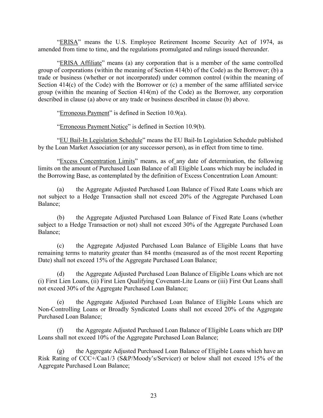 “ERISA” means the U.S. Employee Retirement Income Security Act of 1974, as amended from time to time, and the regulations promulgated and rulings issued thereunder. “ERISA Affiliate” means (a) any corporation that is a member of the same controlled group of corporations (within the meaning of Section 414(b) of the Code) as the Borrower; (b) a trade or business (whether or not incorporated) under common control (within the meaning of Section 414(c) of the Code) with the Borrower or (c) a member of the same affiliated service group (within the meaning of Section 414(m) of the Code) as the Borrower, any corporation described in clause (a) above or any trade or business described in clause (b) above. “Erroneous Payment” is defined in Section 10.9(a). “Erroneous Payment Notice” is defined in Section 10.9(b). “EU Bail-In Legislation Schedule” means the EU Bail-In Legislation Schedule published by the Loan Market Association (or any successor person), as in effect from time to time. “Excess Concentration Limits” means, as of any date of determination, the following limits on the amount of Purchased Loan Balance of all Eligible Loans which may be included in the Borrowing Base, as contemplated by the definition of Excess Concentration Loan Amount: (a) the Aggregate Adjusted Purchased Loan Balance of Fixed Rate Loans which are not subject to a Hedge Transaction shall not exceed 20% of the Aggregate Purchased Loan Balance; (b) the Aggregate Adjusted Purchased Loan Balance of Fixed Rate Loans (whether subject to a Hedge Transaction or not) shall not exceed 30% of the Aggregate Purchased Loan Balance; (c) the Aggregate Adjusted Purchased Loan Balance of Eligible Loans that have remaining terms to maturity greater than 84 months (measured as of the most recent Reporting Date) shall not exceed 15% of the Aggregate Purchased Loan Balance; (d) the Aggregate Adjusted Purchased Loan Balance of Eligible Loans which are not (i) First Lien Loans, (ii) First Lien Qualifying Covenant-Lite Loans or (iii) First Out Loans shall not exceed 30% of the Aggregate Purchased Loan Balance; (e) the Aggregate Adjusted Purchased Loan Balance of Eligible Loans which are Non-Controlling Loans or Broadly Syndicated Loans shall not exceed 20% of the Aggregate Purchased Loan Balance; (f) the Aggregate Adjusted Purchased Loan Balance of Eligible Loans which are DIP Loans shall not exceed 10% of the Aggregate Purchased Loan Balance; (g) the Aggregate Adjusted Purchased Loan Balance of Eligible Loans which have an Risk Rating of CCC+/Caa1/3 (S&P/Moody’s/Servicer) or below shall not exceed 15% of the Aggregate Purchased Loan Balance; 23