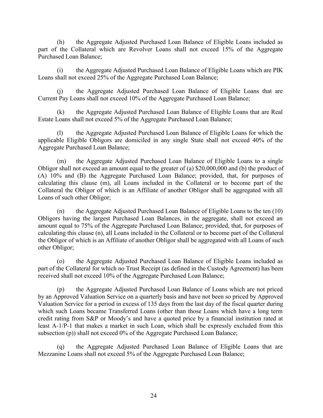 (h) the Aggregate Adjusted Purchased Loan Balance of Eligible Loans included as part of the Collateral which are Revolver Loans shall not exceed 15% of the Aggregate Purchased Loan Balance; (i) the Aggregate Adjusted Purchased Loan Balance of Eligible Loans which are PIK Loans shall not exceed 25% of the Aggregate Purchased Loan Balance; (j) the Aggregate Adjusted Purchased Loan Balance of Eligible Loans that are Current Pay Loans shall not exceed 10% of the Aggregate Purchased Loan Balance; (k) the Aggregate Adjusted Purchased Loan Balance of Eligible Loans that are Real Estate Loans shall not exceed 5% of the Aggregate Purchased Loan Balance; (l) the Aggregate Adjusted Purchased Loan Balance of Eligible Loans for which the applicable Eligible Obligors are domiciled in any single State shall not exceed 40% of the Aggregate Purchased Loan Balance; (m) the Aggregate Adjusted Purchased Loan Balance of Eligible Loans to a single Obligor shall not exceed an amount equal to the greater of (a) $20,000,000 and (b) the product of (A) 10% and (B) the Aggregate Purchased Loan Balance; provided, that, for purposes of calculating this clause (m), all Loans included in the Collateral or to become part of the Collateral the Obligor of which is an Affiliate of another Obligor shall be aggregated with all Loans of such other Obligor; (n) the Aggregate Adjusted Purchased Loan Balance of Eligible Loans to the ten (10) Obligors having the largest Purchased Loan Balances, in the aggregate, shall not exceed an amount equal to 75% of the Aggregate Purchased Loan Balance; provided, that, for purposes of calculating this clause (n), all Loans included in the Collateral or to become part of the Collateral the Obligor of which is an Affiliate of another Obligor shall be aggregated with all Loans of such other Obligor; (o) the Aggregate Adjusted Purchased Loan Balance of Eligible Loans included as part of the Collateral for which no Trust Receipt (as defined in the Custody Agreement) has been received shall not exceed 10% of the Aggregate Purchased Loan Balance; (p) the Aggregate Adjusted Purchased Loan Balance of Loans which are not priced by an Approved Valuation Service on a quarterly basis and have not been so priced by Approved Valuation Service for a period in excess of 135 days from the last day of the fiscal quarter during which such Loans became Transferred Loans (other than those Loans which have a long term credit rating from S&P or Moody’s and have a quoted price by a financial institution rated at least A-1/P-1 that makes a market in such Loan, which shall be expressly excluded from this subsection (p)) shall not exceed 0% of the Aggregate Purchased Loan Balance; (q) the Aggregate Adjusted Purchased Loan Balance of Eligible Loans that are Mezzanine Loans shall not exceed 5% of the Aggregate Purchased Loan Balance; 24