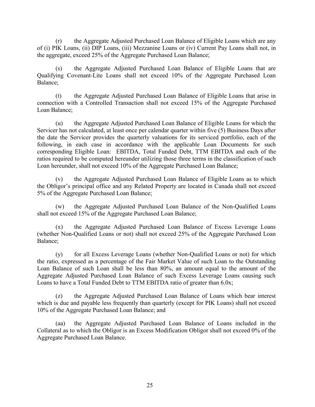 (r) the Aggregate Adjusted Purchased Loan Balance of Eligible Loans which are any of (i) PIK Loans, (ii) DIP Loans, (iii) Mezzanine Loans or (iv) Current Pay Loans shall not, in the aggregate, exceed 25% of the Aggregate Purchased Loan Balance; (s) the Aggregate Adjusted Purchased Loan Balance of Eligible Loans that are Qualifying Covenant-Lite Loans shall not exceed 10% of the Aggregate Purchased Loan Balance; (t) the Aggregate Adjusted Purchased Loan Balance of Eligible Loans that arise in connection with a Controlled Transaction shall not exceed 15% of the Aggregate Purchased Loan Balance; (u) the Aggregate Adjusted Purchased Loan Balance of Eligible Loans for which the Servicer has not calculated, at least once per calendar quarter within five (5) Business Days after the date the Servicer provides the quarterly valuations for its serviced portfolio, each of the following, in each case in accordance with the applicable Loan Documents for such corresponding Eligible Loan: EBITDA, Total Funded Debt, TTM EBITDA and each of the ratios required to be computed hereunder utilizing those three terms in the classification of such Loan hereunder, shall not exceed 10% of the Aggregate Purchased Loan Balance; (v) the Aggregate Adjusted Purchased Loan Balance of Eligible Loans as to which the Obligor’s principal office and any Related Property are located in Canada shall not exceed 5% of the Aggregate Purchased Loan Balance; (w) the Aggregate Adjusted Purchased Loan Balance of the Non-Qualified Loans shall not exceed 15% of the Aggregate Purchased Loan Balance; (x) the Aggregate Adjusted Purchased Loan Balance of Excess Leverage Loans (whether Non-Qualified Loans or not) shall not exceed 25% of the Aggregate Purchased Loan Balance; (y) for all Excess Leverage Loans (whether Non-Qualified Loans or not) for which the ratio, expressed as a percentage of the Fair Market Value of such Loan to the Outstanding Loan Balance of such Loan shall be less than 80%, an amount equal to the amount of the Aggregate Adjusted Purchased Loan Balance of such Excess Leverage Loans causing such Loans to have a Total Funded Debt to TTM EBITDA ratio of greater than 6.0x; (z) the Aggregate Adjusted Purchased Loan Balance of Loans which bear interest which is due and payable less frequently than quarterly (except for PIK Loans) shall not exceed 10% of the Aggregate Purchased Loan Balance; and (aa) the Aggregate Adjusted Purchased Loan Balance of Loans included in the Collateral as to which the Obligor is an Excess Modification Obligor shall not exceed 0% of the Aggregate Purchased Loan Balance. 25