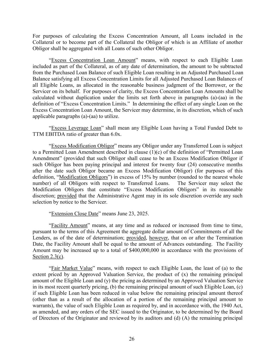 For purposes of calculating the Excess Concentration Amount, all Loans included in the Collateral or to become part of the Collateral the Obligor of which is an Affiliate of another Obligor shall be aggregated with all Loans of such other Obligor. “Excess Concentration Loan Amount” means, with respect to each Eligible Loan included as part of the Collateral, as of any date of determination, the amount to be subtracted from the Purchased Loan Balance of such Eligible Loan resulting in an Adjusted Purchased Loan Balance satisfying all Excess Concentration Limits for all Adjusted Purchased Loan Balances of all Eligible Loans, as allocated in the reasonable business judgment of the Borrower, or the Servicer on its behalf. For purposes of clarity, the Excess Concentration Loan Amounts shall be calculated without duplication under the limits set forth above in paragraphs (a)-(aa) in the definition of “Excess Concentration Limits.” In determining the effect of any single Loan on the Excess Concentration Loan Amount, the Servicer may determine, in its discretion, which of such applicable paragraphs (a)-(aa) to utilize. “Excess Leverage Loan” shall mean any Eligible Loan having a Total Funded Debt to TTM EBITDA ratio of greater than 6.0x. “Excess Modification Obligor” means any Obligor under any Transferred Loan is subject to a Permitted Loan Amendment described in clause (1)(c) of the definition of “Permitted Loan Amendment” (provided that such Obligor shall cease to be an Excess Modification Obligor if such Obligor has been paying principal and interest for twenty four (24) consecutive months after the date such Obligor became an Excess Modification Obligor) (for purposes of this definition, “Modification Obligors”) in excess of 15% by number (rounded to the nearest whole number) of all Obligors with respect to Transferred Loans. The Servicer may select the Modification Obligors that constitute “Excess Modification Obligors” in its reasonable discretion; provided that the Administrative Agent may in its sole discretion override any such selection by notice to the Servicer. “Extension Close Date” means June 23, 2025. “Facility Amount” means, at any time and as reduced or increased from time to time, pursuant to the terms of this Agreement the aggregate dollar amount of Commitments of all the Lenders, as of the date of determination; provided, however, that on or after the Termination Date, the Facility Amount shall be equal to the amount of Advances outstanding. The Facility Amount may be increased up to a total of $400,000,000 in accordance with the provisions of Section 2.3(c). “Fair Market Value” means, with respect to each Eligible Loan, the least of (a) to the extent priced by an Approved Valuation Service, the product of (x) the remaining principal amount of the Eligible Loan and (y) the pricing as determined by an Approved Valuation Service in its most recent quarterly pricing, (b) the remaining principal amount of such Eligible Loan, (c) if such Eligible Loan has been reduced in value below the remaining principal amount thereof (other than as a result of the allocation of a portion of the remaining principal amount to warrants), the value of such Eligible Loan as required by, and in accordance with, the 1940 Act, as amended, and any orders of the SEC issued to the Originator, to be determined by the Board of Directors of the Originator and reviewed by its auditors and (d) (A) the remaining principal 26