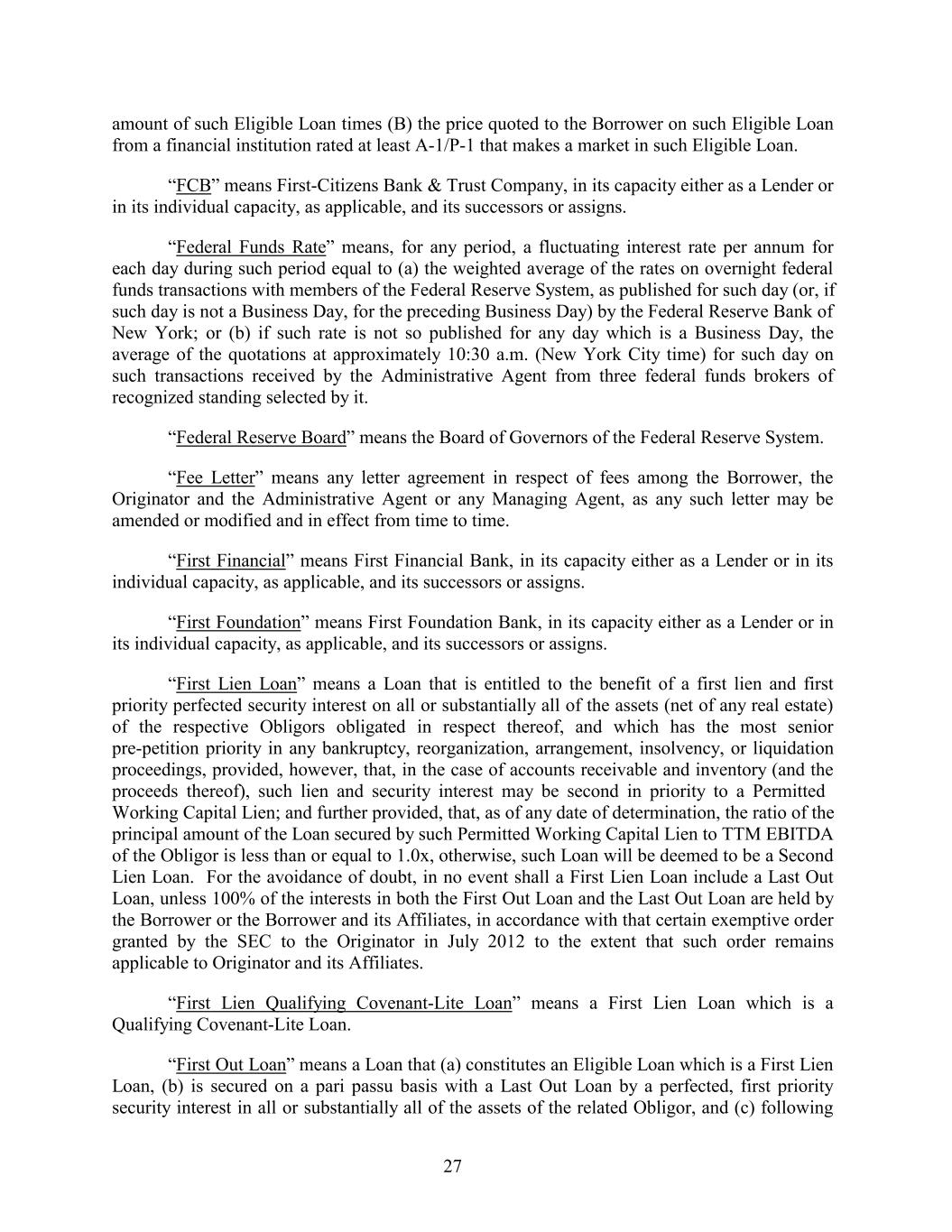 amount of such Eligible Loan times (B) the price quoted to the Borrower on such Eligible Loan from a financial institution rated at least A-1/P-1 that makes a market in such Eligible Loan. “FCB” means First-Citizens Bank & Trust Company, in its capacity either as a Lender or in its individual capacity, as applicable, and its successors or assigns. “Federal Funds Rate” means, for any period, a fluctuating interest rate per annum for each day during such period equal to (a) the weighted average of the rates on overnight federal funds transactions with members of the Federal Reserve System, as published for such day (or, if such day is not a Business Day, for the preceding Business Day) by the Federal Reserve Bank of New York; or (b) if such rate is not so published for any day which is a Business Day, the average of the quotations at approximately 10:30 a.m. (New York City time) for such day on such transactions received by the Administrative Agent from three federal funds brokers of recognized standing selected by it. “Federal Reserve Board” means the Board of Governors of the Federal Reserve System. “Fee Letter” means any letter agreement in respect of fees among the Borrower, the Originator and the Administrative Agent or any Managing Agent, as any such letter may be amended or modified and in effect from time to time. “First Financial” means First Financial Bank, in its capacity either as a Lender or in its individual capacity, as applicable, and its successors or assigns. “First Foundation” means First Foundation Bank, in its capacity either as a Lender or in its individual capacity, as applicable, and its successors or assigns. “First Lien Loan” means a Loan that is entitled to the benefit of a first lien and first priority perfected security interest on all or substantially all of the assets (net of any real estate) of the respective Obligors obligated in respect thereof, and which has the most senior pre-petition priority in any bankruptcy, reorganization, arrangement, insolvency, or liquidation proceedings, provided, however, that, in the case of accounts receivable and inventory (and the proceeds thereof), such lien and security interest may be second in priority to a Permitted Working Capital Lien; and further provided, that, as of any date of determination, the ratio of the principal amount of the Loan secured by such Permitted Working Capital Lien to TTM EBITDA of the Obligor is less than or equal to 1.0x, otherwise, such Loan will be deemed to be a Second Lien Loan. For the avoidance of doubt, in no event shall a First Lien Loan include a Last Out Loan, unless 100% of the interests in both the First Out Loan and the Last Out Loan are held by the Borrower or the Borrower and its Affiliates, in accordance with that certain exemptive order granted by the SEC to the Originator in July 2012 to the extent that such order remains applicable to Originator and its Affiliates. “First Lien Qualifying Covenant-Lite Loan” means a First Lien Loan which is a Qualifying Covenant-Lite Loan. “First Out Loan” means a Loan that (a) constitutes an Eligible Loan which is a First Lien Loan, (b) is secured on a pari passu basis with a Last Out Loan by a perfected, first priority security interest in all or substantially all of the assets of the related Obligor, and (c) following 27