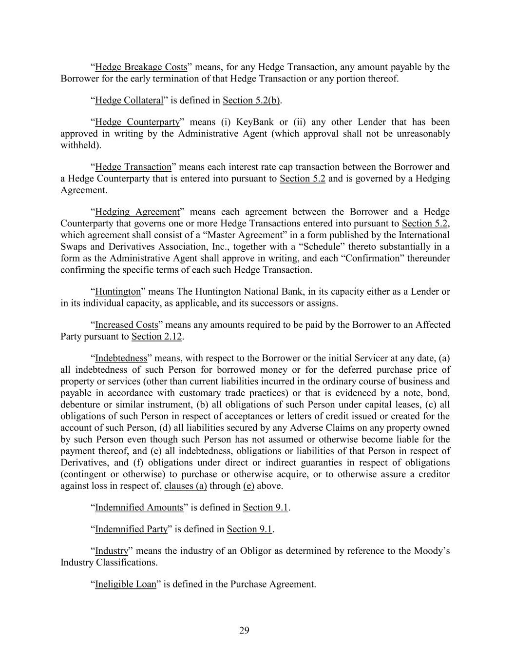 “Hedge Breakage Costs” means, for any Hedge Transaction, any amount payable by the Borrower for the early termination of that Hedge Transaction or any portion thereof. “Hedge Collateral” is defined in Section 5.2(b). “Hedge Counterparty” means (i) KeyBank or (ii) any other Lender that has been approved in writing by the Administrative Agent (which approval shall not be unreasonably withheld). “Hedge Transaction” means each interest rate cap transaction between the Borrower and a Hedge Counterparty that is entered into pursuant to Section 5.2 and is governed by a Hedging Agreement. “Hedging Agreement” means each agreement between the Borrower and a Hedge Counterparty that governs one or more Hedge Transactions entered into pursuant to Section 5.2, which agreement shall consist of a “Master Agreement” in a form published by the International Swaps and Derivatives Association, Inc., together with a “Schedule” thereto substantially in a form as the Administrative Agent shall approve in writing, and each “Confirmation” thereunder confirming the specific terms of each such Hedge Transaction. “Huntington” means The Huntington National Bank, in its capacity either as a Lender or in its individual capacity, as applicable, and its successors or assigns. “Increased Costs” means any amounts required to be paid by the Borrower to an Affected Party pursuant to Section 2.12. “Indebtedness” means, with respect to the Borrower or the initial Servicer at any date, (a) all indebtedness of such Person for borrowed money or for the deferred purchase price of property or services (other than current liabilities incurred in the ordinary course of business and payable in accordance with customary trade practices) or that is evidenced by a note, bond, debenture or similar instrument, (b) all obligations of such Person under capital leases, (c) all obligations of such Person in respect of acceptances or letters of credit issued or created for the account of such Person, (d) all liabilities secured by any Adverse Claims on any property owned by such Person even though such Person has not assumed or otherwise become liable for the payment thereof, and (e) all indebtedness, obligations or liabilities of that Person in respect of Derivatives, and (f) obligations under direct or indirect guaranties in respect of obligations (contingent or otherwise) to purchase or otherwise acquire, or to otherwise assure a creditor against loss in respect of, clauses (a) through (e) above. “Indemnified Amounts” is defined in Section 9.1. “Indemnified Party” is defined in Section 9.1. “Industry” means the industry of an Obligor as determined by reference to the Moody’s Industry Classifications. “Ineligible Loan” is defined in the Purchase Agreement. 29