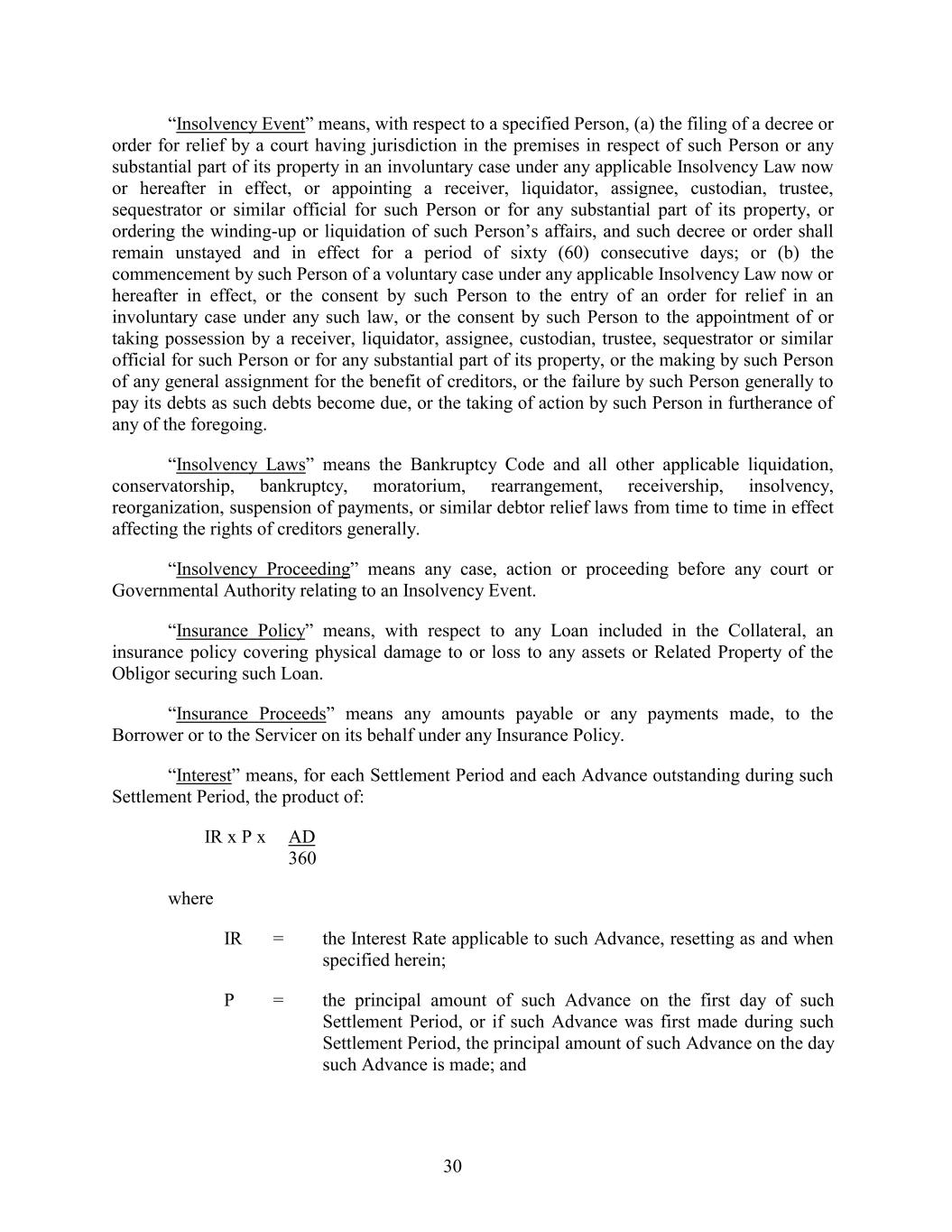30 IR x P x “Insolvency Event” means, with respect to a specified Person, (a) the filing of a decree or order for relief by a court having jurisdiction in the premises in respect of such Person or any substantial part of its property in an involuntary case under any applicable Insolvency Law now or hereafter in effect, or appointing a receiver, liquidator, assignee, custodian, trustee, sequestrator or similar official for such Person or for any substantial part of its property, or ordering the winding-up or liquidation of such Person’s affairs, and such decree or order shall remain unstayed and in effect for a period of sixty (60) consecutive days; or (b) the commencement by such Person of a voluntary case under any applicable Insolvency Law now or hereafter in effect, or the consent by such Person to the entry of an order for relief in an involuntary case under any such law, or the consent by such Person to the appointment of or taking possession by a receiver, liquidator, assignee, custodian, trustee, sequestrator or similar official for such Person or for any substantial part of its property, or the making by such Person of any general assignment for the benefit of creditors, or the failure by such Person generally to pay its debts as such debts become due, or the taking of action by such Person in furtherance of any of the foregoing. “Insolvency Laws” means the Bankruptcy Code and all other applicable liquidation, conservatorship, bankruptcy, moratorium, rearrangement, receivership, insolvency, reorganization, suspension of payments, or similar debtor relief laws from time to time in effect affecting the rights of creditors generally. “Insolvency Proceeding” means any case, action or proceeding before any court or Governmental Authority relating to an Insolvency Event. “Insurance Policy” means, with respect to any Loan included in the Collateral, an insurance policy covering physical damage to or loss to any assets or Related Property of the Obligor securing such Loan. “Insurance Proceeds” means any amounts payable or any payments made, to the Borrower or to the Servicer on its behalf under any Insurance Policy. “Interest” means, for each Settlement Period and each Advance outstanding during such Settlement Period, the product of: AD 360 where IR = the Interest Rate applicable to such Advance, resetting as and when specified herein; P = the principal amount of such Advance on the first day of such Settlement Period, or if such Advance was first made during such Settlement Period, the principal amount of such Advance on the day such Advance is made; and