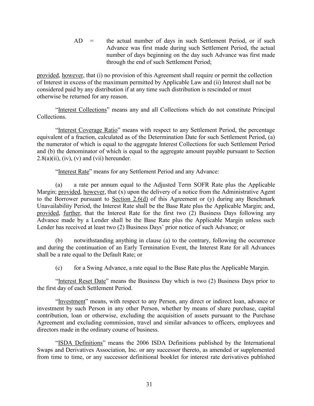 AD = the actual number of days in such Settlement Period, or if such Advance was first made during such Settlement Period, the actual number of days beginning on the day such Advance was first made through the end of such Settlement Period; provided, however, that (i) no provision of this Agreement shall require or permit the collection of Interest in excess of the maximum permitted by Applicable Law and (ii) Interest shall not be considered paid by any distribution if at any time such distribution is rescinded or must otherwise be returned for any reason. “Interest Collections” means any and all Collections which do not constitute Principal Collections. “Interest Coverage Ratio” means with respect to any Settlement Period, the percentage equivalent of a fraction, calculated as of the Determination Date for such Settlement Period, (a) the numerator of which is equal to the aggregate Interest Collections for such Settlement Period and (b) the denominator of which is equal to the aggregate amount payable pursuant to Section 2.8(a)(ii), (iv), (v) and (vii) hereunder. “Interest Rate” means for any Settlement Period and any Advance: (a) a rate per annum equal to the Adjusted Term SOFR Rate plus the Applicable Margin; provided, however, that (x) upon the delivery of a notice from the Administrative Agent to the Borrower pursuant to Section 2.6(d) of this Agreement or (y) during any Benchmark Unavailability Period, the Interest Rate shall be the Base Rate plus the Applicable Margin; and, provided, further, that the Interest Rate for the first two (2) Business Days following any Advance made by a Lender shall be the Base Rate plus the Applicable Margin unless such Lender has received at least two (2) Business Days’ prior notice of such Advance; or (b) notwithstanding anything in clause (a) to the contrary, following the occurrence and during the continuation of an Early Termination Event, the Interest Rate for all Advances shall be a rate equal to the Default Rate; or (c) for a Swing Advance, a rate equal to the Base Rate plus the Applicable Margin. “Interest Reset Date” means the Business Day which is two (2) Business Days prior to the first day of each Settlement Period. “Investment” means, with respect to any Person, any direct or indirect loan, advance or investment by such Person in any other Person, whether by means of share purchase, capital contribution, loan or otherwise, excluding the acquisition of assets pursuant to the Purchase Agreement and excluding commission, travel and similar advances to officers, employees and directors made in the ordinary course of business. “ISDA Definitions” means the 2006 ISDA Definitions published by the International Swaps and Derivatives Association, Inc. or any successor thereto, as amended or supplemented from time to time, or any successor definitional booklet for interest rate derivatives published 31
