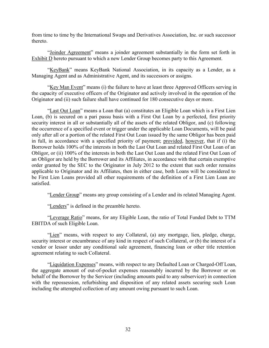 from time to time by the International Swaps and Derivatives Association, Inc. or such successor thereto. “Joinder Agreement” means a joinder agreement substantially in the form set forth in Exhibit D hereto pursuant to which a new Lender Group becomes party to this Agreement. “KeyBank” means KeyBank National Association, in its capacity as a Lender, as a Managing Agent and as Administrative Agent, and its successors or assigns. “Key Man Event” means (i) the failure to have at least three Approved Officers serving in the capacity of executive officers of the Originator and actively involved in the operation of the Originator and (ii) such failure shall have continued for 180 consecutive days or more. “Last Out Loan” means a Loan that (a) constitutes an Eligible Loan which is a First Lien Loan, (b) is secured on a pari passu basis with a First Out Loan by a perfected, first priority security interest in all or substantially all of the assets of the related Obligor, and (c) following the occurrence of a specified event or trigger under the applicable Loan Documents, will be paid only after all or a portion of the related First Out Loan issued by the same Obligor has been paid in full, in accordance with a specified priority of payment; provided, however, that if (i) the Borrower holds 100% of the interests in both the Last Out Loan and related First Out Loan of an Obligor, or (ii) 100% of the interests in both the Last Out Loan and the related First Out Loan of an Obligor are held by the Borrower and its Affiliates, in accordance with that certain exemptive order granted by the SEC to the Originator in July 2012 to the extent that such order remains applicable to Originator and its Affiliates, then in either case, both Loans will be considered to be First Lien Loans provided all other requirements of the definition of a First Lien Loan are satisfied. “Lender Group” means any group consisting of a Lender and its related Managing Agent. “Lenders” is defined in the preamble hereto. “Leverage Ratio” means, for any Eligible Loan, the ratio of Total Funded Debt to TTM EBITDA of such Eligible Loan. “Lien” means, with respect to any Collateral, (a) any mortgage, lien, pledge, charge, security interest or encumbrance of any kind in respect of such Collateral, or (b) the interest of a vendor or lessor under any conditional sale agreement, financing loan or other title retention agreement relating to such Collateral. “Liquidation Expenses” means, with respect to any Defaulted Loan or Charged-Off Loan, the aggregate amount of out-of-pocket expenses reasonably incurred by the Borrower or on behalf of the Borrower by the Servicer (including amounts paid to any subservicer) in connection with the repossession, refurbishing and disposition of any related assets securing such Loan including the attempted collection of any amount owing pursuant to such Loan. 32