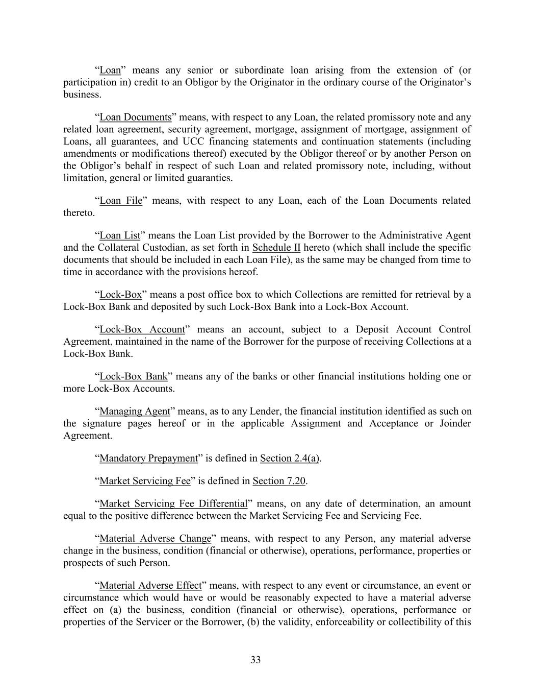 “Loan” means any senior or subordinate loan arising from the extension of (or participation in) credit to an Obligor by the Originator in the ordinary course of the Originator’s business. “Loan Documents” means, with respect to any Loan, the related promissory note and any related loan agreement, security agreement, mortgage, assignment of mortgage, assignment of Loans, all guarantees, and UCC financing statements and continuation statements (including amendments or modifications thereof) executed by the Obligor thereof or by another Person on the Obligor’s behalf in respect of such Loan and related promissory note, including, without limitation, general or limited guaranties. “Loan File” means, with respect to any Loan, each of the Loan Documents related thereto. “Loan List” means the Loan List provided by the Borrower to the Administrative Agent and the Collateral Custodian, as set forth in Schedule II hereto (which shall include the specific documents that should be included in each Loan File), as the same may be changed from time to time in accordance with the provisions hereof. “Lock-Box” means a post office box to which Collections are remitted for retrieval by a Lock-Box Bank and deposited by such Lock-Box Bank into a Lock-Box Account. “Lock-Box Account” means an account, subject to a Deposit Account Control Agreement, maintained in the name of the Borrower for the purpose of receiving Collections at a Lock-Box Bank. “Lock-Box Bank” means any of the banks or other financial institutions holding one or more Lock-Box Accounts. “Managing Agent” means, as to any Lender, the financial institution identified as such on the signature pages hereof or in the applicable Assignment and Acceptance or Joinder Agreement. “Mandatory Prepayment” is defined in Section 2.4(a). “Market Servicing Fee” is defined in Section 7.20. “Market Servicing Fee Differential” means, on any date of determination, an amount equal to the positive difference between the Market Servicing Fee and Servicing Fee. “Material Adverse Change” means, with respect to any Person, any material adverse change in the business, condition (financial or otherwise), operations, performance, properties or prospects of such Person. “Material Adverse Effect” means, with respect to any event or circumstance, an event or circumstance which would have or would be reasonably expected to have a material adverse effect on (a) the business, condition (financial or otherwise), operations, performance or properties of the Servicer or the Borrower, (b) the validity, enforceability or collectibility of this 33