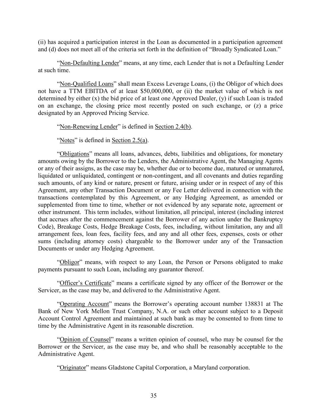 (ii) has acquired a participation interest in the Loan as documented in a participation agreement and (d) does not meet all of the criteria set forth in the definition of “Broadly Syndicated Loan.” “Non-Defaulting Lender” means, at any time, each Lender that is not a Defaulting Lender at such time. “Non-Qualified Loans” shall mean Excess Leverage Loans, (i) the Obligor of which does not have a TTM EBITDA of at least $50,000,000, or (ii) the market value of which is not determined by either (x) the bid price of at least one Approved Dealer, (y) if such Loan is traded on an exchange, the closing price most recently posted on such exchange, or (z) a price designated by an Approved Pricing Service. “Non-Renewing Lender” is defined in Section 2.4(b). “Notes” is defined in Section 2.5(a). “Obligations” means all loans, advances, debts, liabilities and obligations, for monetary amounts owing by the Borrower to the Lenders, the Administrative Agent, the Managing Agents or any of their assigns, as the case may be, whether due or to become due, matured or unmatured, liquidated or unliquidated, contingent or non-contingent, and all covenants and duties regarding such amounts, of any kind or nature, present or future, arising under or in respect of any of this Agreement, any other Transaction Document or any Fee Letter delivered in connection with the transactions contemplated by this Agreement, or any Hedging Agreement, as amended or supplemented from time to time, whether or not evidenced by any separate note, agreement or other instrument. This term includes, without limitation, all principal, interest (including interest that accrues after the commencement against the Borrower of any action under the Bankruptcy Code), Breakage Costs, Hedge Breakage Costs, fees, including, without limitation, any and all arrangement fees, loan fees, facility fees, and any and all other fees, expenses, costs or other sums (including attorney costs) chargeable to the Borrower under any of the Transaction Documents or under any Hedging Agreement. “Obligor” means, with respect to any Loan, the Person or Persons obligated to make payments pursuant to such Loan, including any guarantor thereof. “Officer’s Certificate” means a certificate signed by any officer of the Borrower or the Servicer, as the case may be, and delivered to the Administrative Agent. “Operating Account” means the Borrower’s operating account number 138831 at The Bank of New York Mellon Trust Company, N.A. or such other account subject to a Deposit Account Control Agreement and maintained at such bank as may be consented to from time to time by the Administrative Agent in its reasonable discretion. “Opinion of Counsel” means a written opinion of counsel, who may be counsel for the Borrower or the Servicer, as the case may be, and who shall be reasonably acceptable to the Administrative Agent. “Originator” means Gladstone Capital Corporation, a Maryland corporation. 35