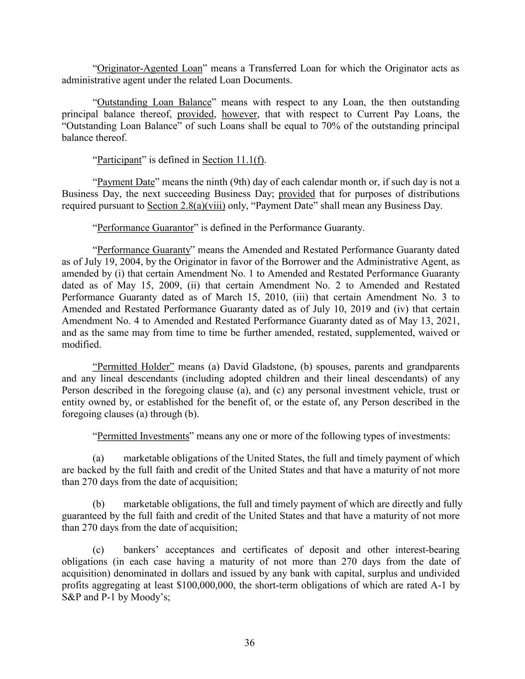 “Originator-Agented Loan” means a Transferred Loan for which the Originator acts as administrative agent under the related Loan Documents. “Outstanding Loan Balance” means with respect to any Loan, the then outstanding principal balance thereof, provided, however, that with respect to Current Pay Loans, the “Outstanding Loan Balance” of such Loans shall be equal to 70% of the outstanding principal balance thereof. “Participant” is defined in Section 11.1(f). “Payment Date” means the ninth (9th) day of each calendar month or, if such day is not a Business Day, the next succeeding Business Day; provided that for purposes of distributions required pursuant to Section 2.8(a)(viii) only, “Payment Date” shall mean any Business Day. “Performance Guarantor” is defined in the Performance Guaranty. “Performance Guaranty” means the Amended and Restated Performance Guaranty dated as of July 19, 2004, by the Originator in favor of the Borrower and the Administrative Agent, as amended by (i) that certain Amendment No. 1 to Amended and Restated Performance Guaranty dated as of May 15, 2009, (ii) that certain Amendment No. 2 to Amended and Restated Performance Guaranty dated as of March 15, 2010, (iii) that certain Amendment No. 3 to Amended and Restated Performance Guaranty dated as of July 10, 2019 and (iv) that certain Amendment No. 4 to Amended and Restated Performance Guaranty dated as of May 13, 2021, and as the same may from time to time be further amended, restated, supplemented, waived or modified. “Permitted Holder” means (a) David Gladstone, (b) spouses, parents and grandparents and any lineal descendants (including adopted children and their lineal descendants) of any Person described in the foregoing clause (a), and (c) any personal investment vehicle, trust or entity owned by, or established for the benefit of, or the estate of, any Person described in the foregoing clauses (a) through (b). “Permitted Investments” means any one or more of the following types of investments: (a) marketable obligations of the United States, the full and timely payment of which are backed by the full faith and credit of the United States and that have a maturity of not more than 270 days from the date of acquisition; (b) marketable obligations, the full and timely payment of which are directly and fully guaranteed by the full faith and credit of the United States and that have a maturity of not more than 270 days from the date of acquisition; (c) bankers’ acceptances and certificates of deposit and other interest-bearing obligations (in each case having a maturity of not more than 270 days from the date of acquisition) denominated in dollars and issued by any bank with capital, surplus and undivided profits aggregating at least $100,000,000, the short-term obligations of which are rated A-1 by S&P and P-1 by Moody’s; 36