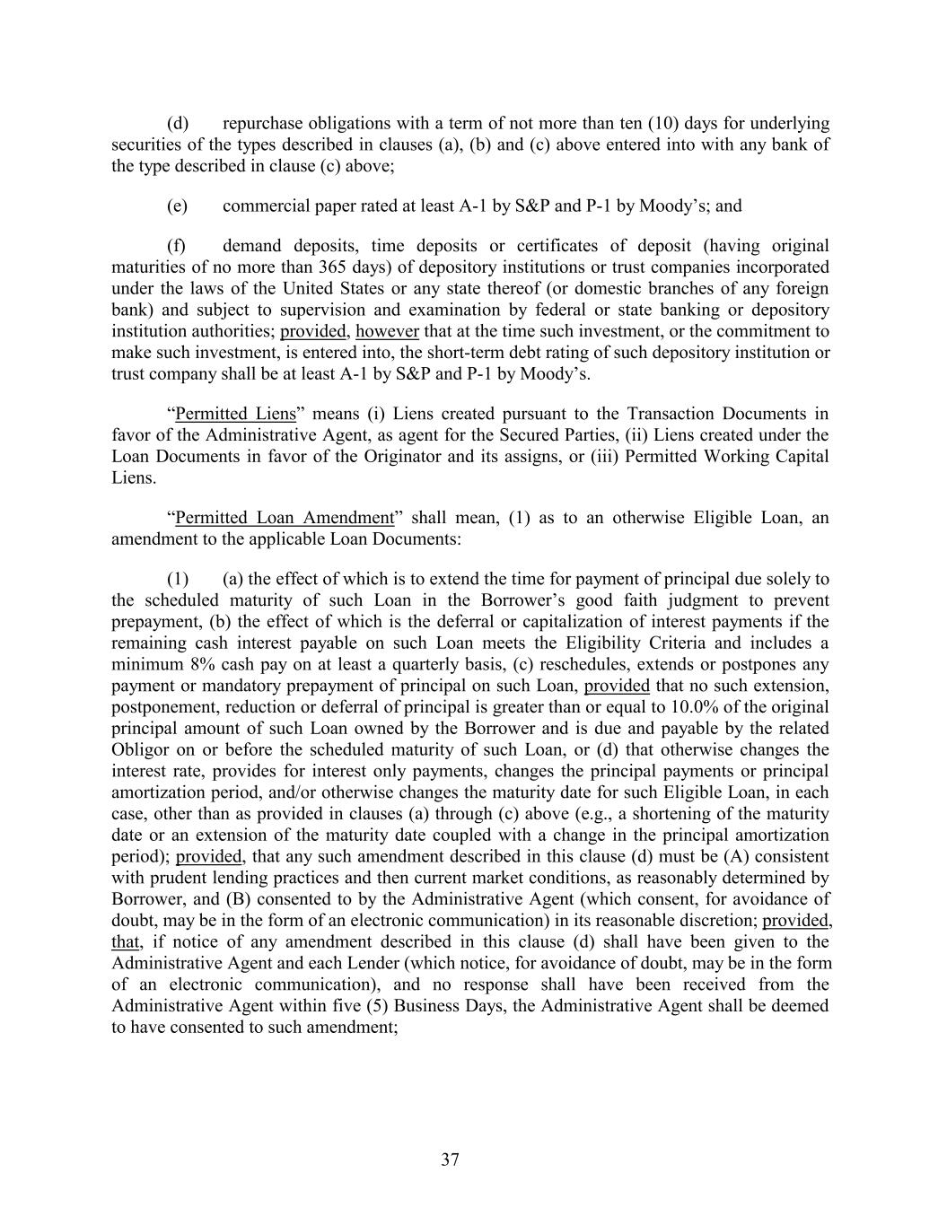 (d) repurchase obligations with a term of not more than ten (10) days for underlying securities of the types described in clauses (a), (b) and (c) above entered into with any bank of the type described in clause (c) above; (e) commercial paper rated at least A-1 by S&P and P-1 by Moody’s; and (f) demand deposits, time deposits or certificates of deposit (having original maturities of no more than 365 days) of depository institutions or trust companies incorporated under the laws of the United States or any state thereof (or domestic branches of any foreign bank) and subject to supervision and examination by federal or state banking or depository institution authorities; provided, however that at the time such investment, or the commitment to make such investment, is entered into, the short-term debt rating of such depository institution or trust company shall be at least A-1 by S&P and P-1 by Moody’s. “Permitted Liens” means (i) Liens created pursuant to the Transaction Documents in favor of the Administrative Agent, as agent for the Secured Parties, (ii) Liens created under the Loan Documents in favor of the Originator and its assigns, or (iii) Permitted Working Capital Liens. “Permitted Loan Amendment” shall mean, (1) as to an otherwise Eligible Loan, an amendment to the applicable Loan Documents: (1) (a) the effect of which is to extend the time for payment of principal due solely to the scheduled maturity of such Loan in the Borrower’s good faith judgment to prevent prepayment, (b) the effect of which is the deferral or capitalization of interest payments if the remaining cash interest payable on such Loan meets the Eligibility Criteria and includes a minimum 8% cash pay on at least a quarterly basis, (c) reschedules, extends or postpones any payment or mandatory prepayment of principal on such Loan, provided that no such extension, postponement, reduction or deferral of principal is greater than or equal to 10.0% of the original principal amount of such Loan owned by the Borrower and is due and payable by the related Obligor on or before the scheduled maturity of such Loan, or (d) that otherwise changes the interest rate, provides for interest only payments, changes the principal payments or principal amortization period, and/or otherwise changes the maturity date for such Eligible Loan, in each case, other than as provided in clauses (a) through (c) above (e.g., a shortening of the maturity date or an extension of the maturity date coupled with a change in the principal amortization period); provided, that any such amendment described in this clause (d) must be (A) consistent with prudent lending practices and then current market conditions, as reasonably determined by Borrower, and (B) consented to by the Administrative Agent (which consent, for avoidance of doubt, may be in the form of an electronic communication) in its reasonable discretion; provided, that, if notice of any amendment described in this clause (d) shall have been given to the Administrative Agent and each Lender (which notice, for avoidance of doubt, may be in the form of an electronic communication), and no response shall have been received from the Administrative Agent within five (5) Business Days, the Administrative Agent shall be deemed to have consented to such amendment; 37