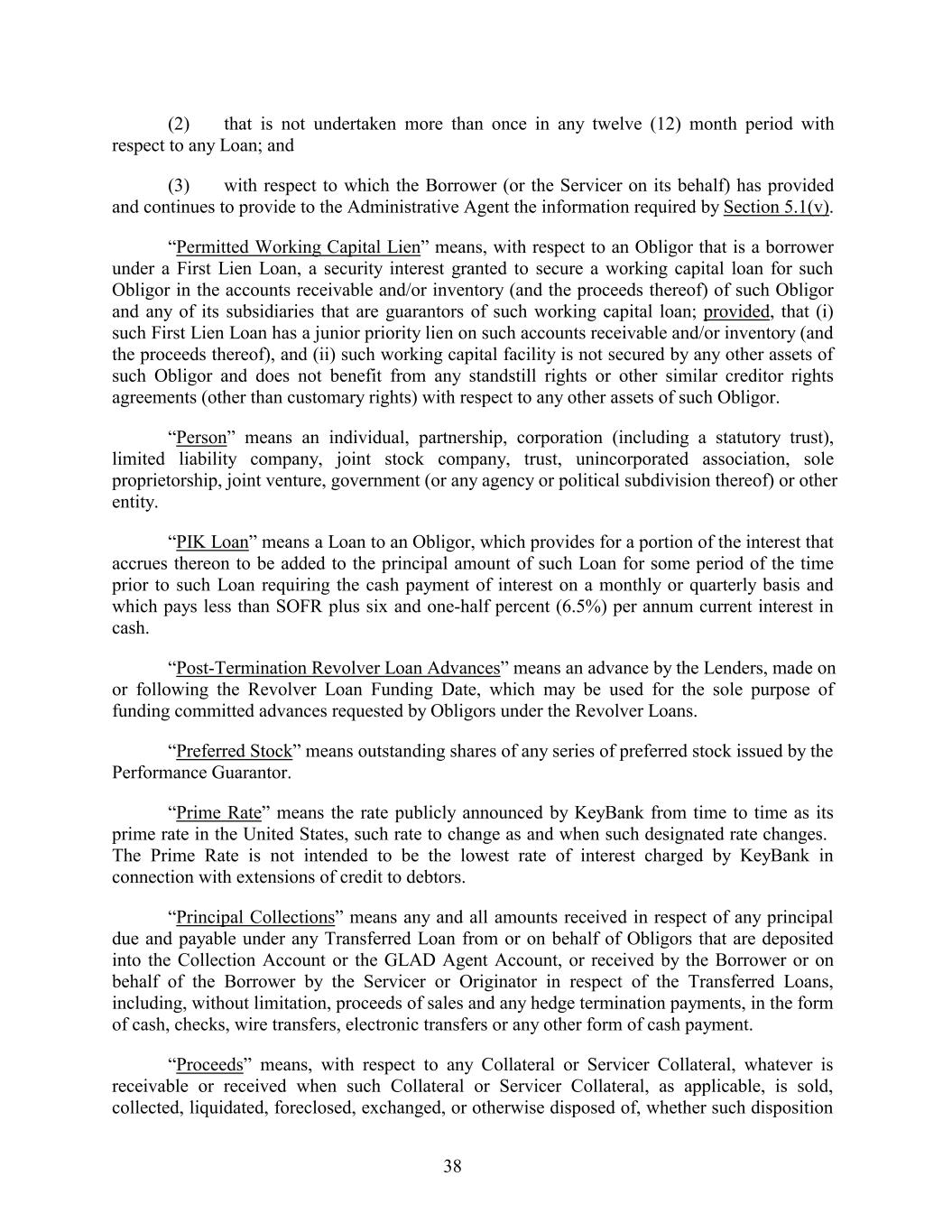 (2) that is not undertaken more than once in any twelve (12) month period with respect to any Loan; and (3) with respect to which the Borrower (or the Servicer on its behalf) has provided and continues to provide to the Administrative Agent the information required by Section 5.1(v). “Permitted Working Capital Lien” means, with respect to an Obligor that is a borrower under a First Lien Loan, a security interest granted to secure a working capital loan for such Obligor in the accounts receivable and/or inventory (and the proceeds thereof) of such Obligor and any of its subsidiaries that are guarantors of such working capital loan; provided, that (i) such First Lien Loan has a junior priority lien on such accounts receivable and/or inventory (and the proceeds thereof), and (ii) such working capital facility is not secured by any other assets of such Obligor and does not benefit from any standstill rights or other similar creditor rights agreements (other than customary rights) with respect to any other assets of such Obligor. “Person” means an individual, partnership, corporation (including a statutory trust), limited liability company, joint stock company, trust, unincorporated association, sole proprietorship, joint venture, government (or any agency or political subdivision thereof) or other entity. “PIK Loan” means a Loan to an Obligor, which provides for a portion of the interest that accrues thereon to be added to the principal amount of such Loan for some period of the time prior to such Loan requiring the cash payment of interest on a monthly or quarterly basis and which pays less than SOFR plus six and one-half percent (6.5%) per annum current interest in cash. “Post-Termination Revolver Loan Advances” means an advance by the Lenders, made on or following the Revolver Loan Funding Date, which may be used for the sole purpose of funding committed advances requested by Obligors under the Revolver Loans. “Preferred Stock” means outstanding shares of any series of preferred stock issued by the Performance Guarantor. “Prime Rate” means the rate publicly announced by KeyBank from time to time as its prime rate in the United States, such rate to change as and when such designated rate changes. The Prime Rate is not intended to be the lowest rate of interest charged by KeyBank in connection with extensions of credit to debtors. “Principal Collections” means any and all amounts received in respect of any principal due and payable under any Transferred Loan from or on behalf of Obligors that are deposited into the Collection Account or the GLAD Agent Account, or received by the Borrower or on behalf of the Borrower by the Servicer or Originator in respect of the Transferred Loans, including, without limitation, proceeds of sales and any hedge termination payments, in the form of cash, checks, wire transfers, electronic transfers or any other form of cash payment. “Proceeds” means, with respect to any Collateral or Servicer Collateral, whatever is receivable or received when such Collateral or Servicer Collateral, as applicable, is sold, collected, liquidated, foreclosed, exchanged, or otherwise disposed of, whether such disposition 38